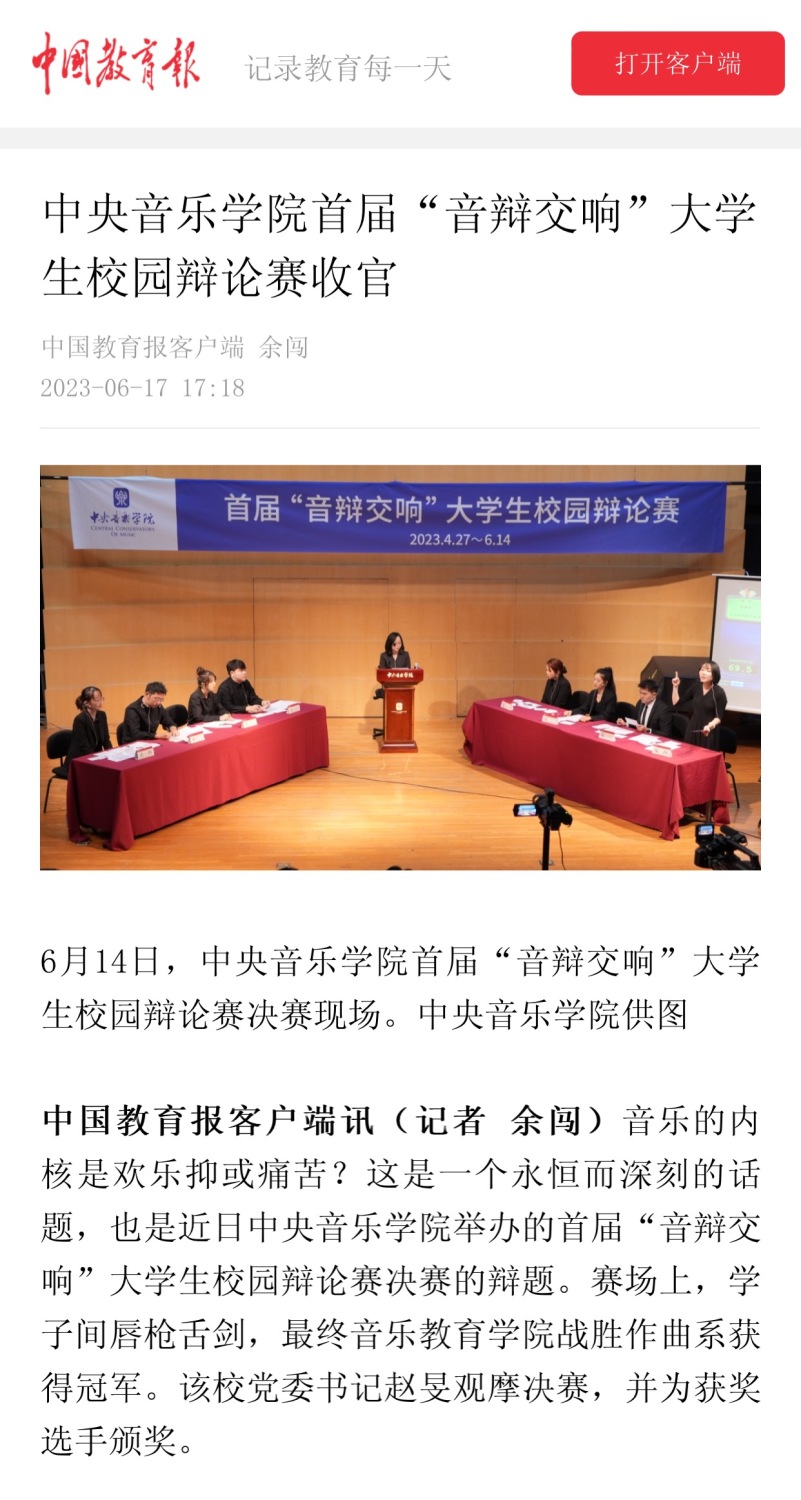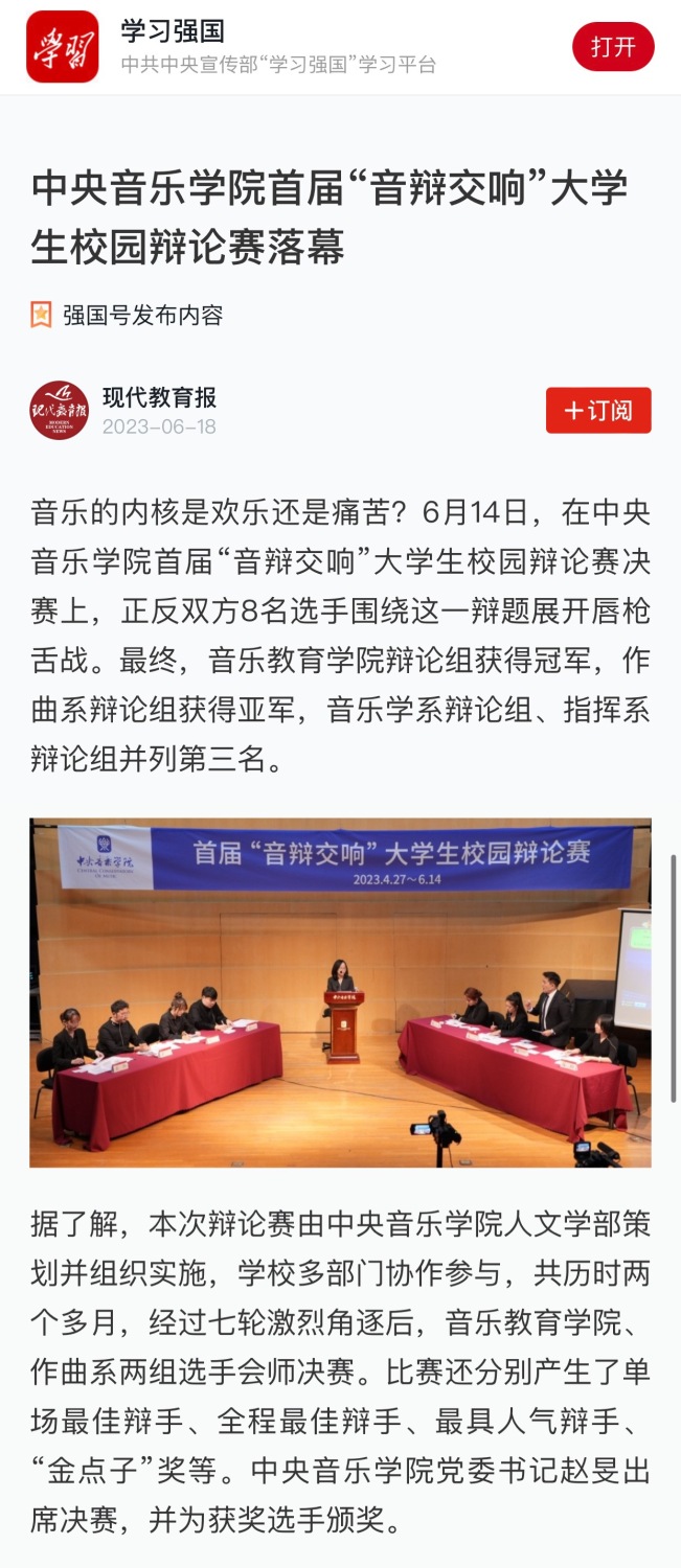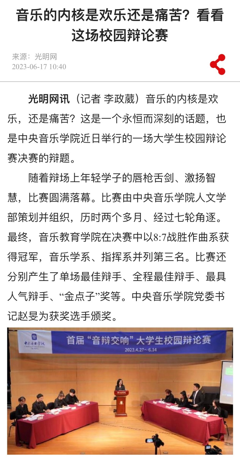 音乐的内核是欢乐还是痛苦?这是一个永恒而深刻的话题,也是best365首届“音辩交响”大学生校园辩论赛决赛的辩题。6月14日,随着辩场上年轻学子们的唇枪舌剑、激扬智慧,决赛在琴房楼演奏厅圆满落幕。