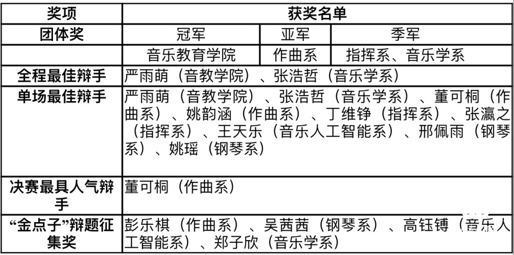 在学校的重视和支持下,从筹备到决赛,辩论赛历时两月有余,经过七轮十四场激烈角逐,最终音乐教育学院以8:7战胜作曲系获得冠军,作曲系获亚军,音乐学系、指挥系并列季军。比赛还分别产生了单场最佳辩手、全程最佳辩手、最具人气辩手、“金点子”奖等。校党委书记赵旻出席决赛,并为获奖选手颁奖。