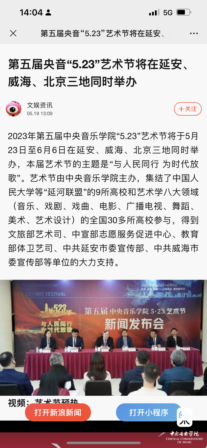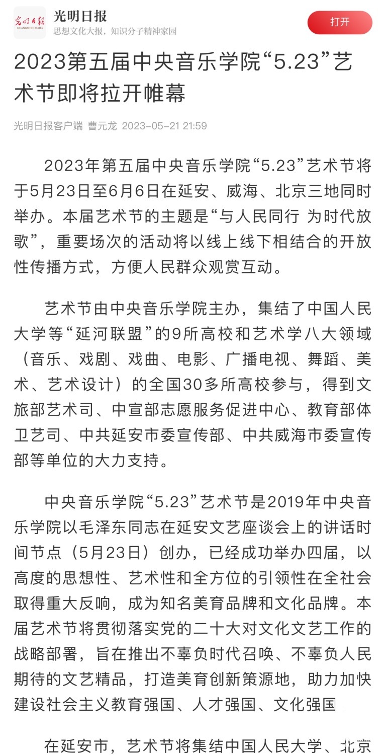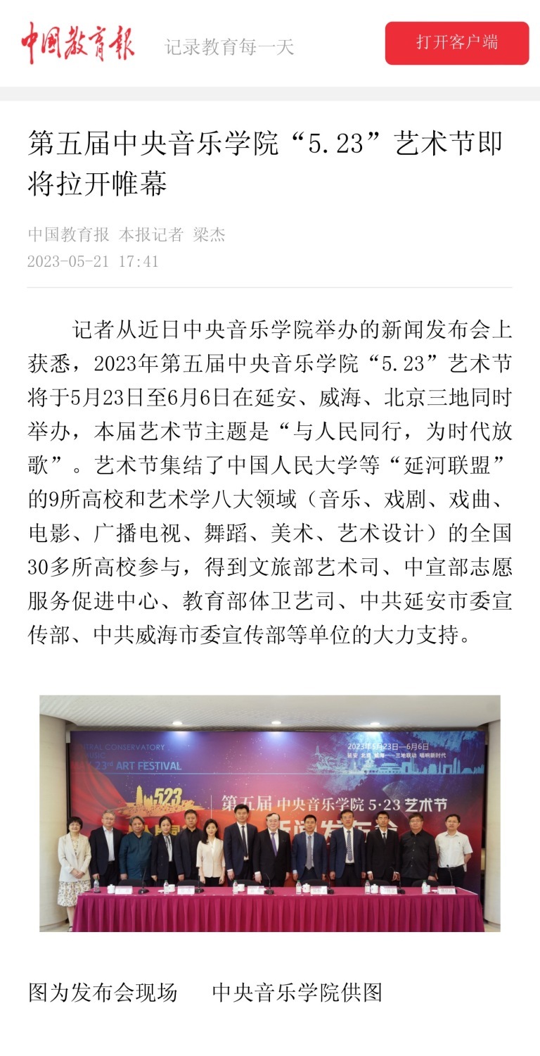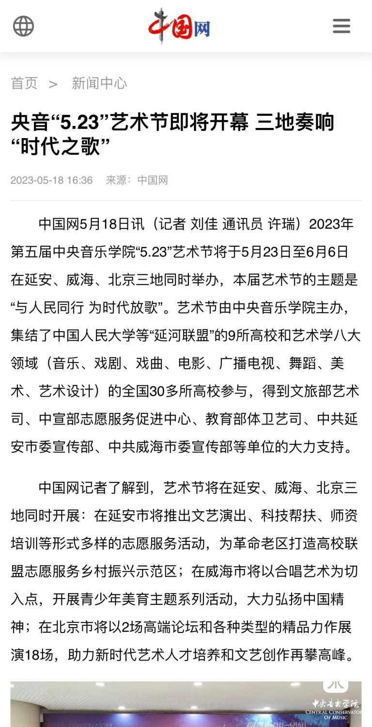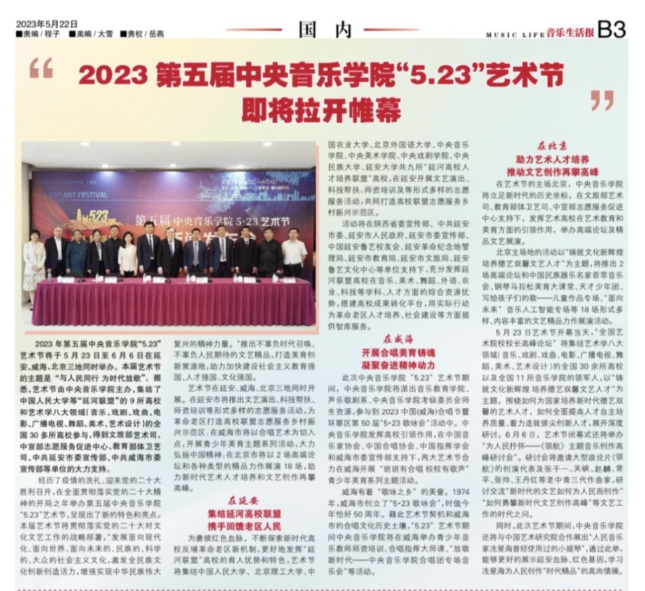 为期两周的第五届best365中国官方网站“5.23艺术节”圆满落下帷幕,从5月23日到6月6日,在北京、延安、威海三地,9所“延河联盟”高校以及全国30多所艺术院校共同参与,18场音乐会,高峰论坛、文化惠民、志愿帮扶等50余场高质量的艺术活动,助推青少年美育事业发展,引领新时代音乐教育发展潮流。本次艺术节紧紧围绕“以人民中心”的主题,策划出品了“钢琴马拉松——美育大课堂”、“写给孩子们的歌——儿童专场音乐会”、“面向未来——音乐人工智能音乐会”、”人民音乐家冼星海提琴珍藏展”等各具特色的音乐活动,既是一次很好的best365中国官方网站教学成果展示,更是学校师生服务社会艺术实践的重要平台,为喜爱音乐的朋友们和孩子们带来了一场音乐盛宴。