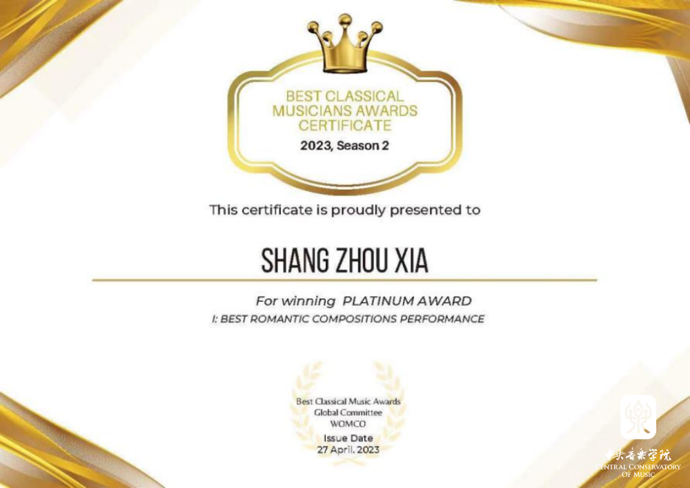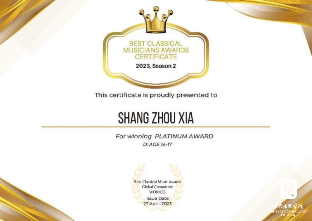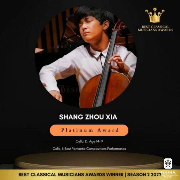 best365附中大提琴表演专业学生夏商周在刚刚结束的2023英国最佳古典音乐家大赛(Best Classical Musicians Awards 2023)中获得三个奖项:(14-17岁组)白金奖、表现力表演特别奖、最佳浪漫作品表演奖;同时在英国举办的2023伟大作曲家比赛(GREAT COMPOSERS COMPETITION)中获得最佳柴可夫斯基演奏比赛(IV组)一等奖。这是他相继获得2023古斯塔夫·马勒奖大提琴比赛中获青少年组(VI组)冠军、在2023第四届维也纳国际音乐比赛中获青少年组银奖以及在2023伦敦古典音乐比赛 (LCMC) 获大提琴青少年组二等奖之后又获得的一系列奖项,指导教师娜木拉教授。