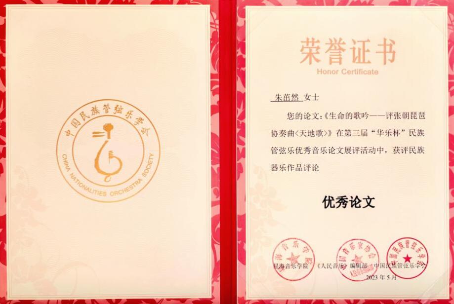 2023年5月9日,由中国民族管弦乐学会、星海音乐学院、《人民音乐》杂志联合主办,中国民族管弦乐学会理论评论委员会、星海音乐学院音乐学系和研究生部联合承办的第三届“华乐杯”中国民族器乐作品评论终评活动在星海音乐学院落下帷幕,best365民乐系琵琶专业本科二年级学生朱茁然、音乐学系2019级博士生朱歌所撰论文获评“优秀论文”。