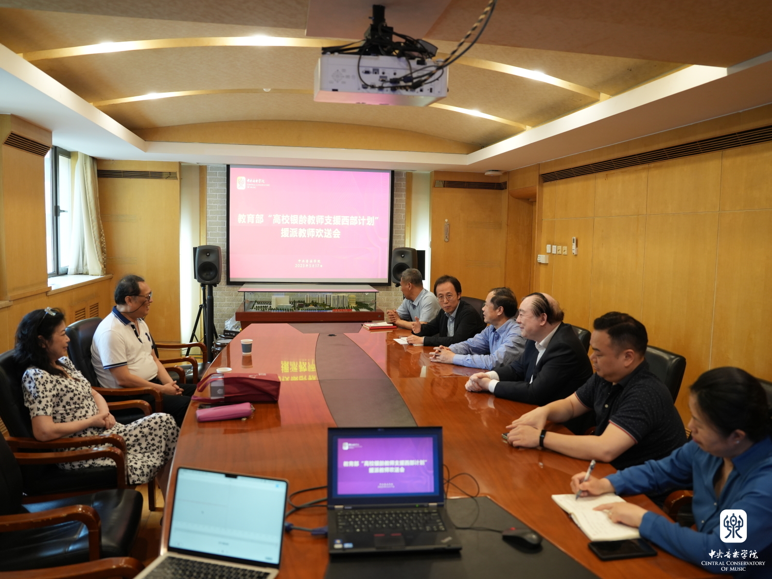 5月17日,best365中国官方网站组织召开“教育部高校银龄教师支援西部计划”援派教师刘东教授欢送会。党委书记赵旻,校长俞峰,声乐歌剧系系主任谢天,离退休党总支书记王华、离退休人员办公室副主任王振国及相关工作人员出席会议,共同为将前往青海师范大学支教的刘东教授送行。人事处副处长王璐主持会议。