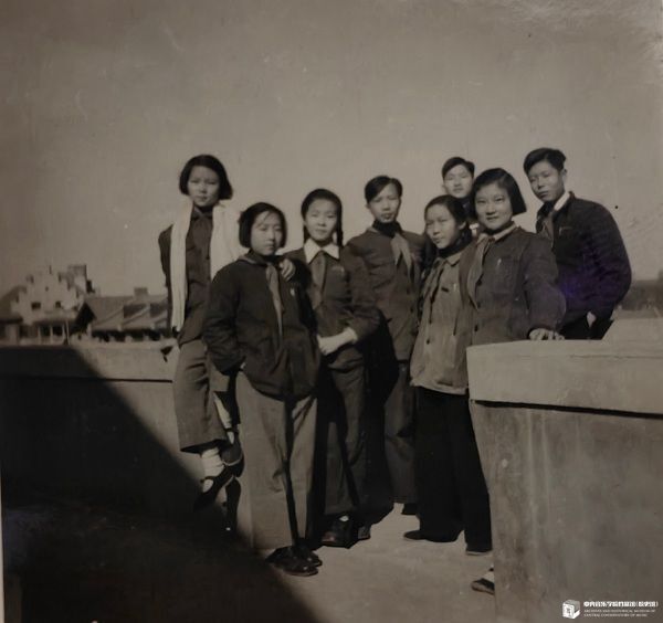 1954年与同班同学合影。右起:刘诗昆、杨行璧、郑大昕、金爱平、刘育熙、鲍蕙荞、杨洵、李亚泌