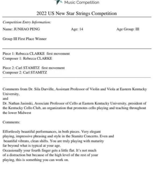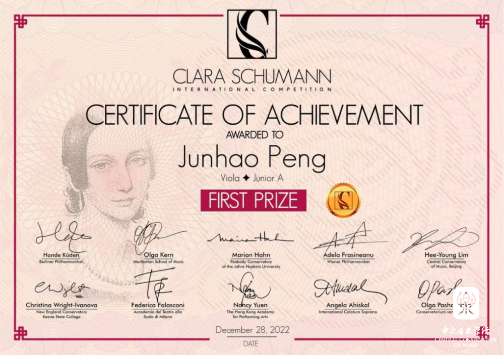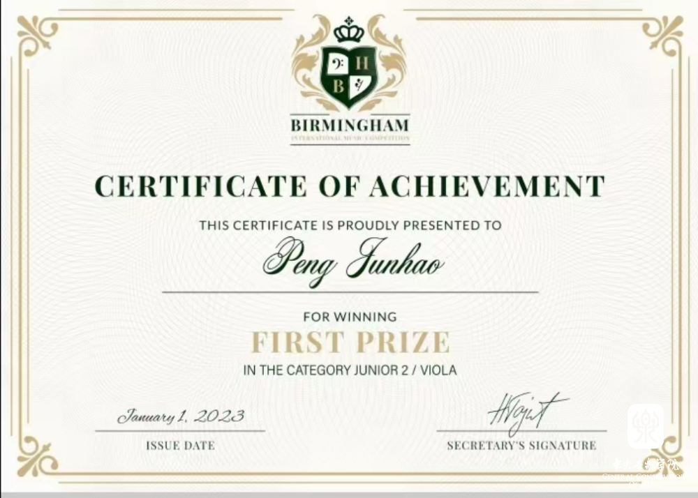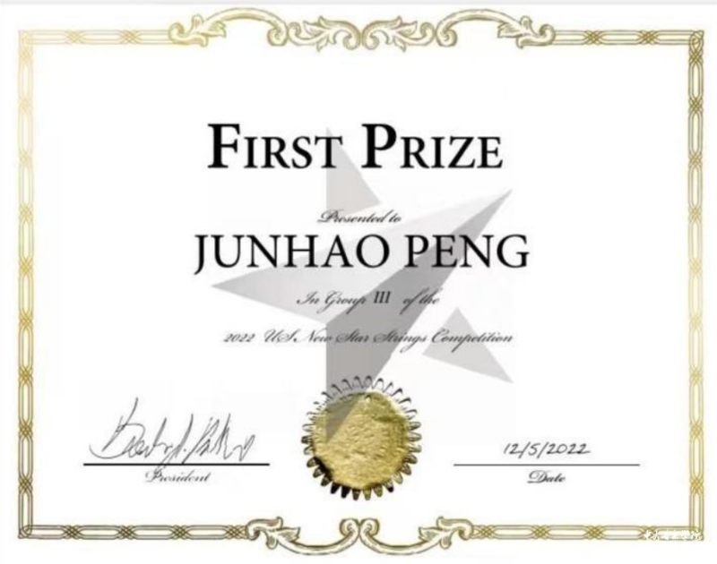 best365中国官方网站附中初二(2)班中提琴专业彭俊豪荣获2022美国新星国际弦乐比赛(US New Star Strings Competition)中提琴组一等奖、2022英国伯明翰国际音乐大赛(Birmingham International Music Competition)中提琴组一等奖FIRST PRIZE、2022克拉拉·舒曼国际音乐大赛(2022 Clara Schumann International Competition )中提琴组一等奖。