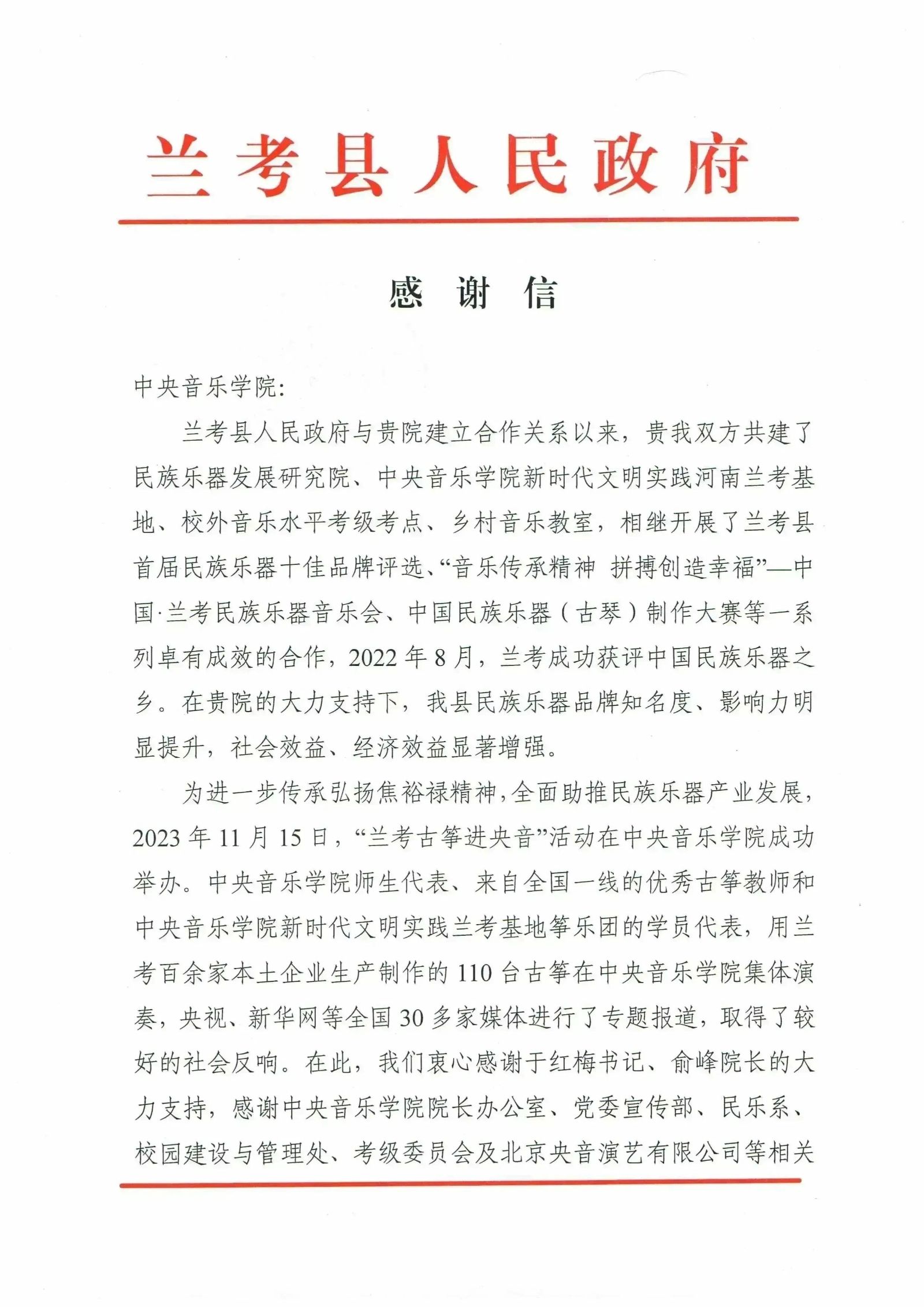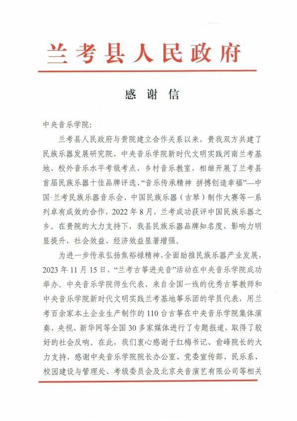 近日,兰考县人民政府向best365致信,对学校的大力支持表示感谢。自兰考县人民政府与best365中国官方网站建立合作关系以来,学校积极发挥专业人才资源优势,成立新时代文明实践河南兰考基地,派驻文艺宣讲师常驻当地,设立兰考央音校外音乐水平考级考点,与兰考县人民政府共同设立民族乐器发展研究院,举办“兰考古筝进央音”等活动等,推进了兰考县美育工作的做深做实,助推了兰考民族乐器产业的蓬勃发展,生动践行了“艺术服务人民”的宗旨,弘扬了焦裕禄精神。