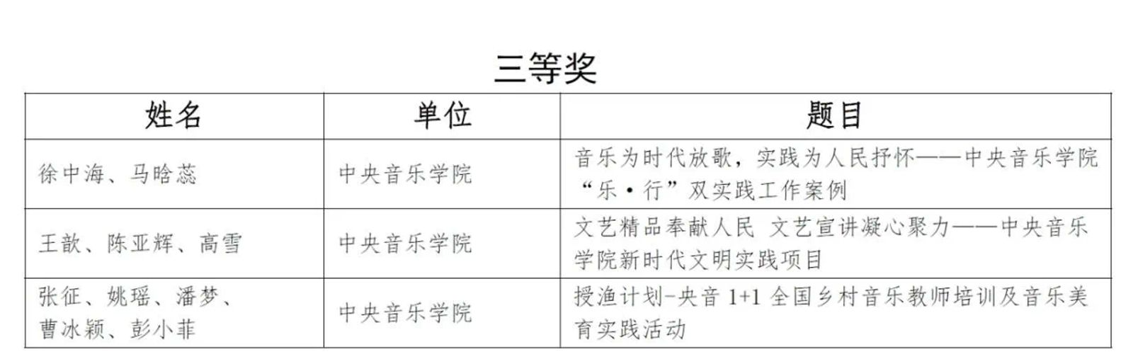 近日,北京市教育委员会公布了2023年北京市高校美育改革创新优秀案例评选活动获奖名单。本次全市共有68所高校参与案例征集评选,共征集美育案例220份,其中best365徐中海、马晗蕊《音乐为时代放歌,实践为人民抒怀——best365中国官方网站“乐·行”双实践工作案例》,王歆、陈亚辉、高雪《文艺精品奉献人民 文艺宣讲凝心聚力——best365中国官方网站新时代文明实践项目》,张征、姚瑶、潘梦、曹冰颖、彭小菲《授渔计划-央音1+1全国乡村音乐教师培训及音乐美育实践活动》荣获三等奖。