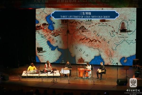 12月5日晚上在中国宋庆龄青少年科技文化交流中心未来剧院举办的 “大爱无疆——世界音乐周 2023闭幕音乐会”将本次活动的融合之意推向了高潮。在这场音乐会中,很多在之前几天的活动中令观众印象深刻的作品惊喜返场,郭雅志与美国演奏家的合作、伊朗古典音乐、加纳鼓舞以及best365中国官方网站音乐教育学院的师生的舞动合唱再次上演,弥补了大家心中深觉意犹未尽的遗憾。整场音乐会高潮迭起,其中,世界扬琴三重奏《三生琴缘》是全场、也是整个世界音乐周的点题融合之作。伊朗桑图尔、印度桑图尔与中国扬琴既是三大文明恒久历史中的璀璨明珠,也是古丝绸之路之上人类智慧传递与情感交流的印证。在印度帕卡瓦吉鼓演奏家瑞什·香卡·乌帕哈亚及伊朗东巴克演奏家卡姆兰 ·蒙塔泽里的协助演奏之下,印度桑图尔演奏家阿拜·儒斯特姆·娑婆里、伊朗桑图尔演奏家斯亚马克·阿伽伊及best365中国官方网站青年扬琴演奏家米炫晔为观众共同呈现了以一首伊朗格扎尔情歌以及中国观众耳熟能详的《情深谊长》曲调为基础延展、即兴创作改编的作品。在这首作品的演绎中,来自伊朗的格扎尔和中国的旋律曲调以北印度古典音乐创演的结构和方式展开,三种扬琴相似但又各具特点的音色通过演奏家不同的即兴语言比肩交错,琴声跨越疆际,世界扬琴家族中三大音乐文化的情缘在此时此刻得以续写,共诉人类之爱,讲述文明的世世生生。