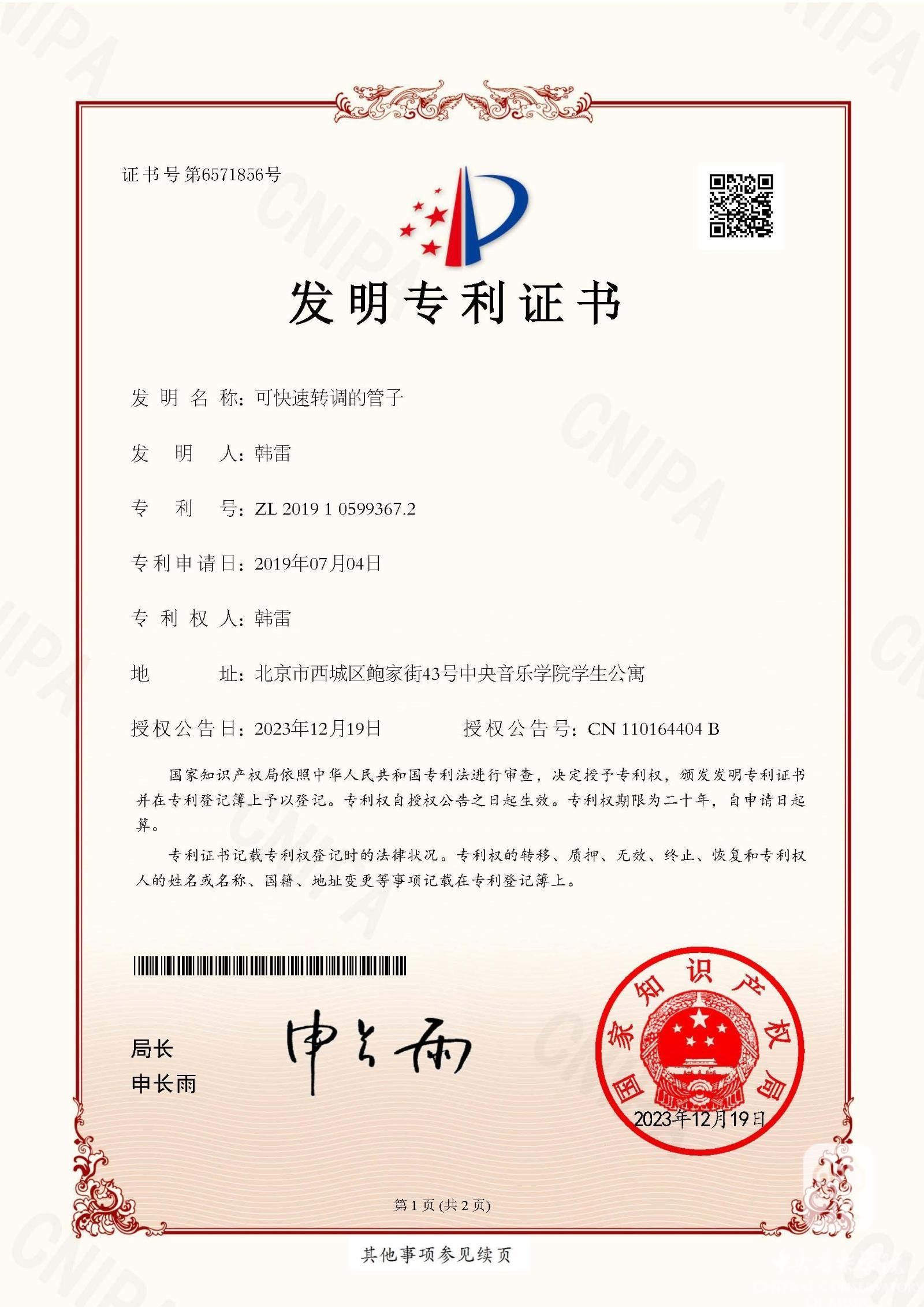 专利是指受国家法律保护的发明和创造,在中国分为发明专利、实用新型专利和外观设计专利三种类型,其中以发明专利的技术含量、价值、认可度、保护期限、申请难度为最高。据了解,此次韩雷教授“可快速转调的管子”发明专利是他在长期的专业实践中持续探索试验所取得的成果,该成果曾于2020年获得国家“实用新型专利”,此次申报获批的是经无数次改进和创新的3.0版。目前,该成果已进入小批量试产阶段,并将逐步投放市场。