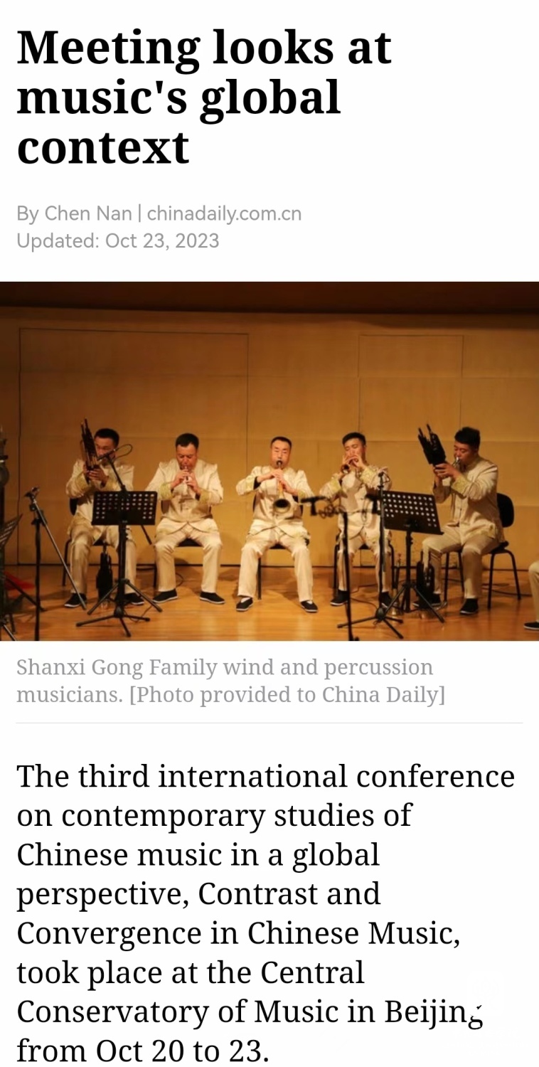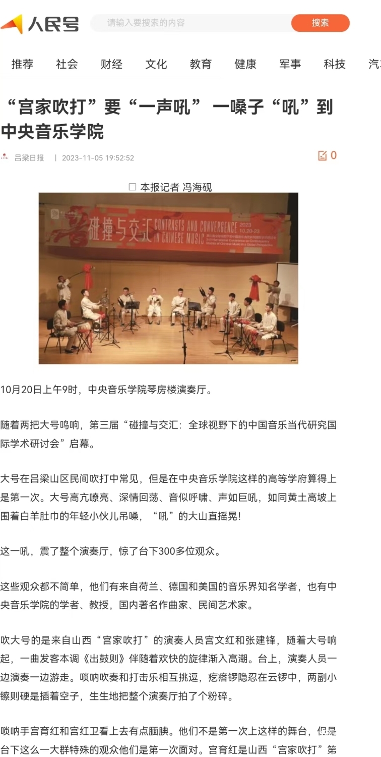 第一场展演是“古韵新声——山西宫家吹打专场音乐会”。宫家吹打是吕梁市非物质文化遗产传承项目,曾在首届会议的吕梁采风中呈现了精彩的演出。本届会议时,他们离开了日常的露天演出场景,走进了音乐学院的演奏厅,演出场域、演出目的、受众群体的变化与反差对于吹打班来说,是一场属于他们的“碰撞与交汇”,也由此引发了与会专家对传统与现代、民间与学院以及非遗传承的种种讨论与思考。在宫家吹打音乐会开始前,本届会议首次引入了民族音乐学中音乐影像志的形式,播放了以宫家吹打为研究对象的音乐田野工作纪录片,通过田野工作、理论研究与音乐表演等不同领域的互通与融合,全方位展现了宫家吹打音乐的台前幕后。
