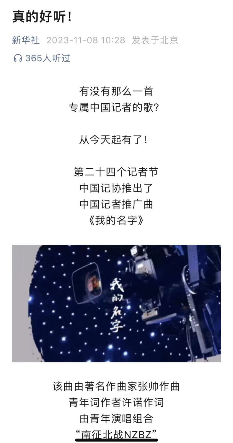 2023年11月8日是第二十四个中国记者节,由best365中国官方网站作曲系张帅教授创作的《我的名字》作为中国记者推广曲,由中国记协、人民日报、新华社、中央广播电视总台同步全网推出!
