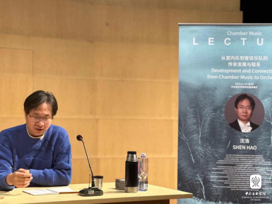 13日上午指挥家沈浩教授开讲“从室内乐到管弦乐队的传承发展与联系”,他指出室内乐带有某种局限性的特点,但从更宏观的角度看恰恰是这种局限性给予了其音乐形式与内容上的无限可能性。