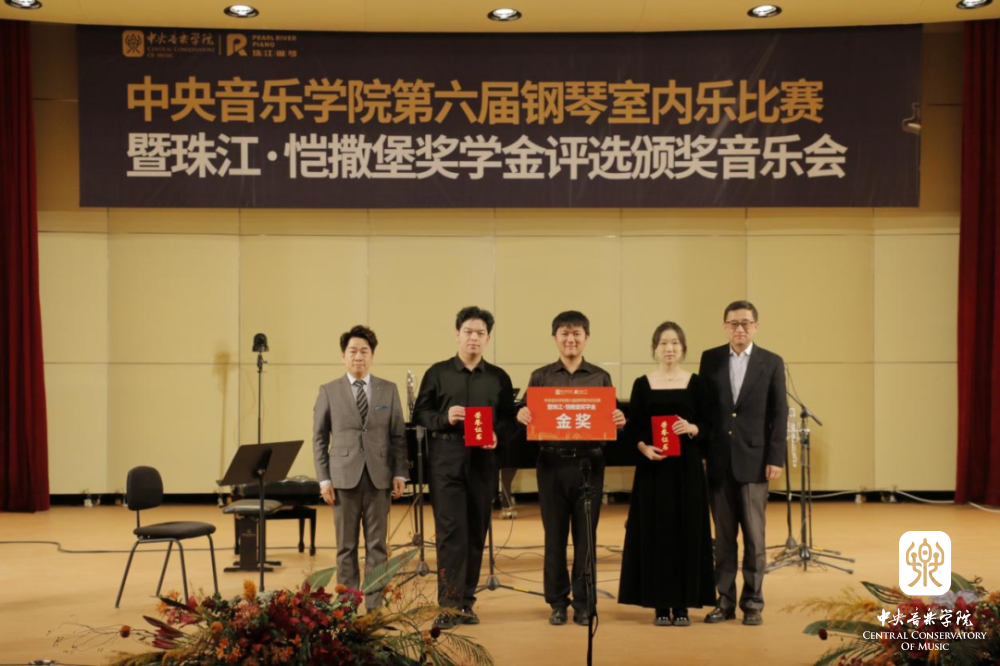 颁奖嘉宾为获得第六届钢琴室内乐比赛暨“珠江·恺撒堡”奖学金大赛金奖的选手颁奖
