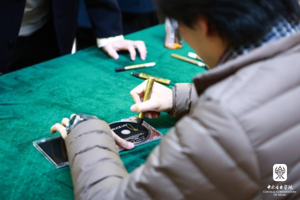 当大师课和访谈落下帷幕,观众的热情并未减去,刘晓禹来到琴房楼友谊厅与到场的观众们近距离互动。同学们向刘晓禹表达了喜爱和热情,请他在曲谱、平板电脑、唱片上签名,以激励自己未来的音乐学习。