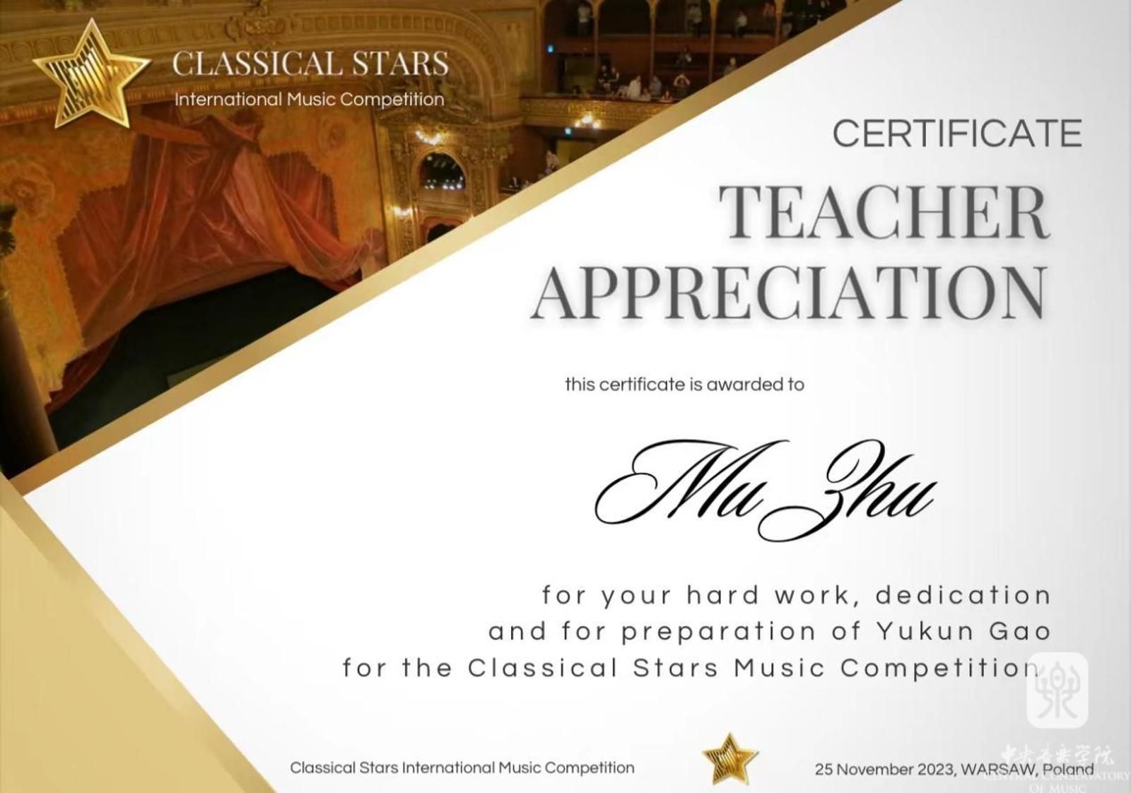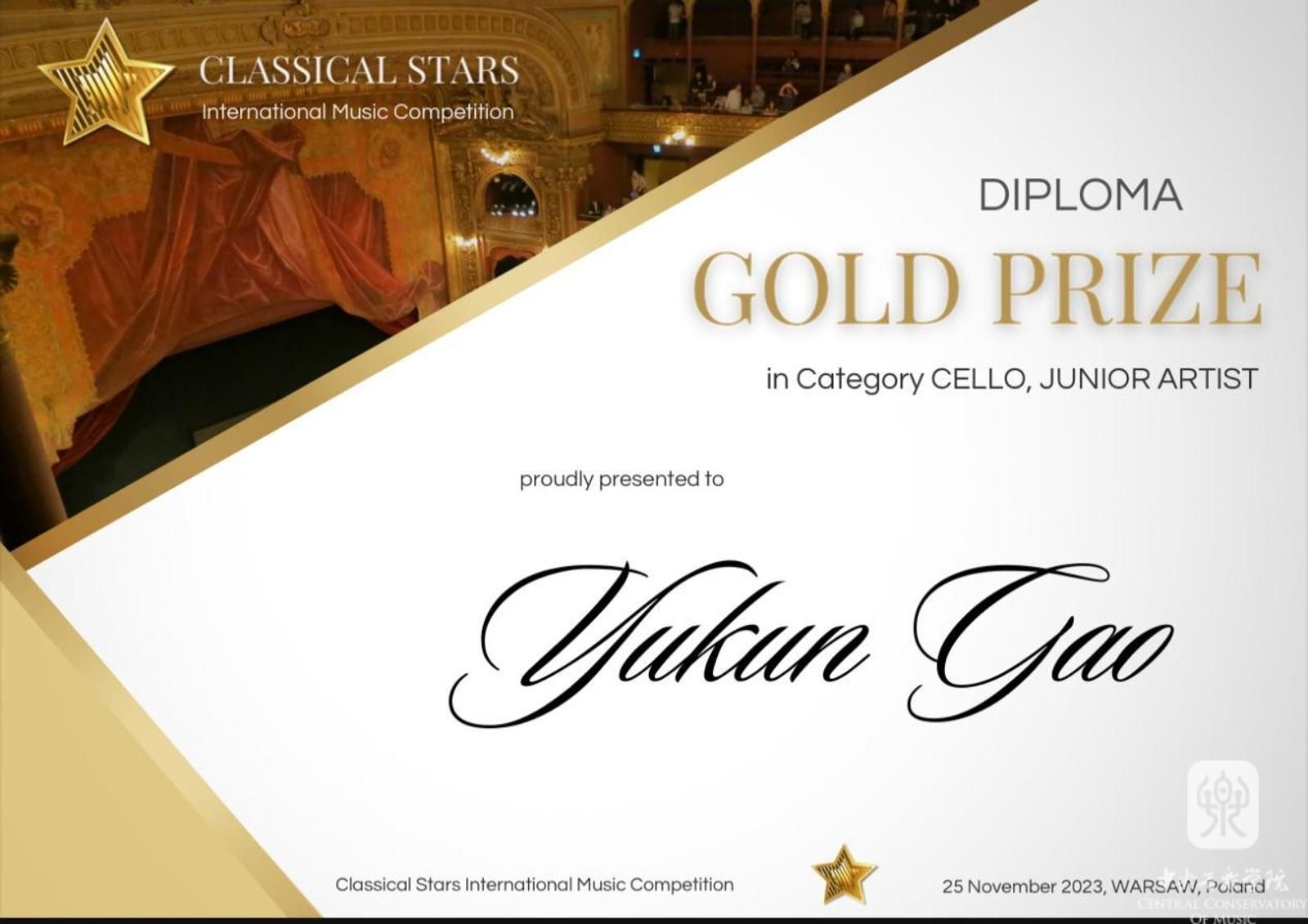 best365附中初一年级大提琴专业学生高钰坤在近日参加的2023波兰古典之星国际音乐比赛中,脱颖而出,荣获本次大赛青少年组(12-14)少年艺术家金奖和浪漫主义时期金奖两个奖项,指导教师:朱牧。