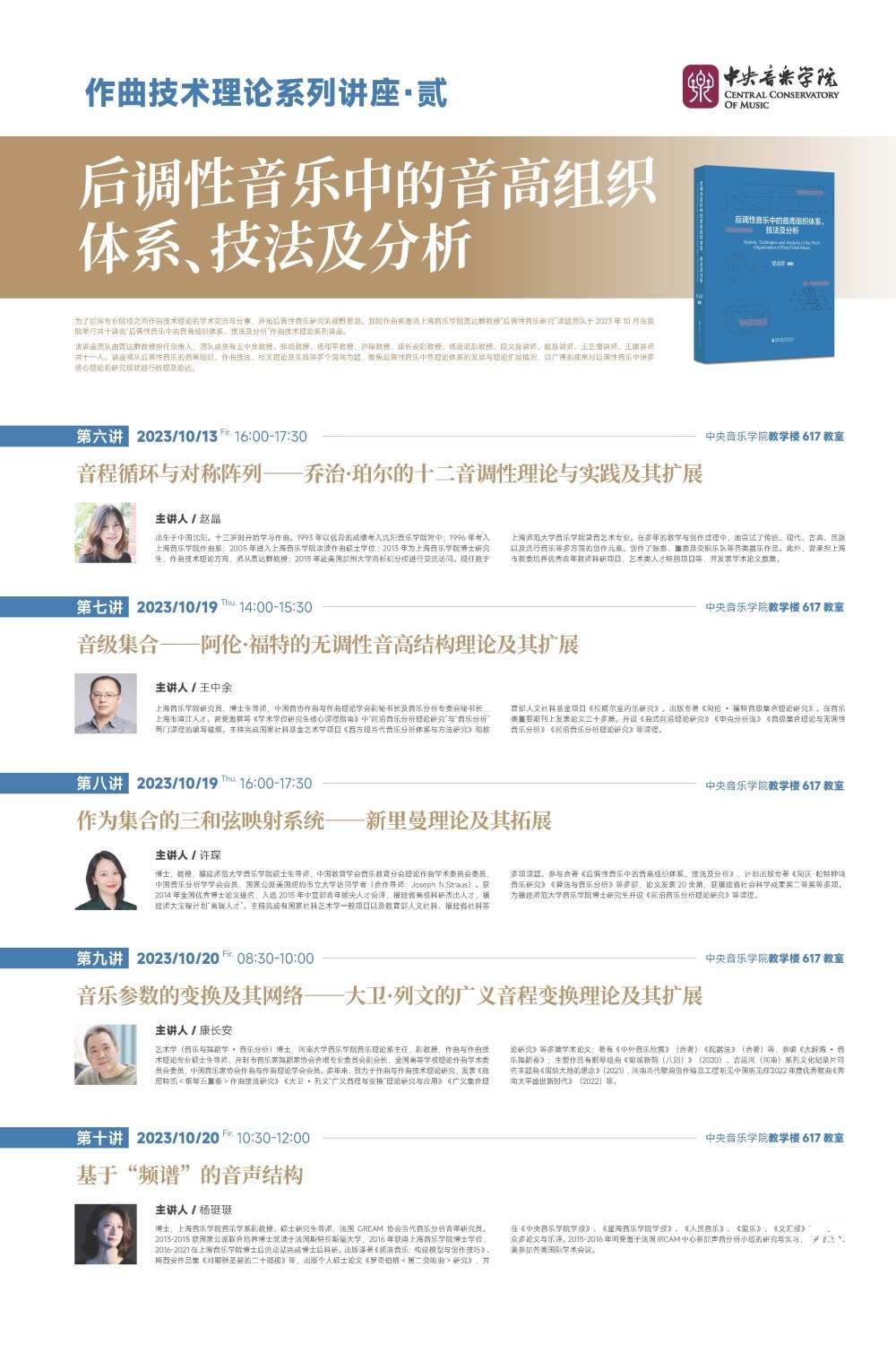 十场讲座针对后调性音乐音高体系的多个重要前沿理论的核心概念、运用方法、发展脉络、研究现状进行全面的阐述和梳理。回顾过往,理论家和研究者们在作品中提炼出与其相适应的、供分析使用的理论;时至今日,这些技术理论又继续在当代音乐的创作中为其提供源源不断的养分和动力。随着时间的推移、新作的涌现,音高理论势必会随之持续发展和完善,并不断显现出理论与创作的双向促进和互融。