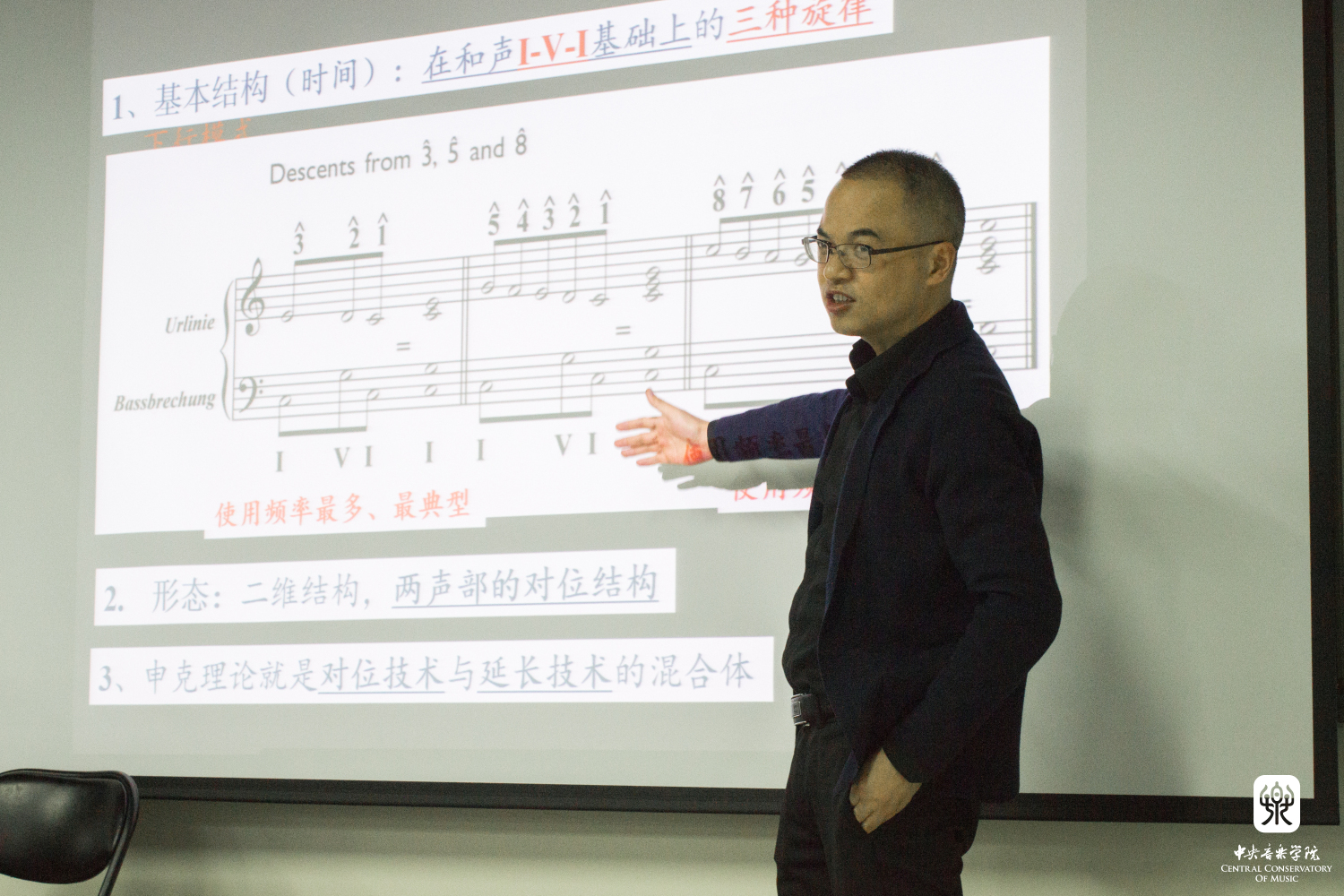 随后的讲座为许琛教授的“作为集合的三和弦映射系统——新里曼理论及其拓展”。许老师以“0-1”比喻一个理论的缘起,“2-99”比喻我们在此理论上做出的发展。她首先介绍了新里曼的“0-1”的突破——即理论形成的起因,又强调新里曼理论的适用性之广泛,该理论既适用于瓦格纳之后的具有强烈半音化特征的音乐作品,也同样适用于以三和弦为基础的调性音乐。随后她展开讲解新里曼理论的六个核心概念:关联倒影与关联移位、三和弦变换模式、共同音与声部节俭进行、等音等同、调的关系图表等。并通过对实际作品的分析展示新里曼理论的“2-99”,即该理论的运用及扩展与创新。