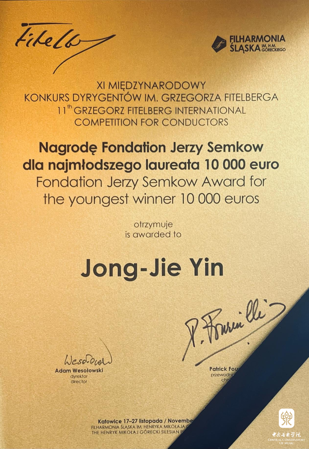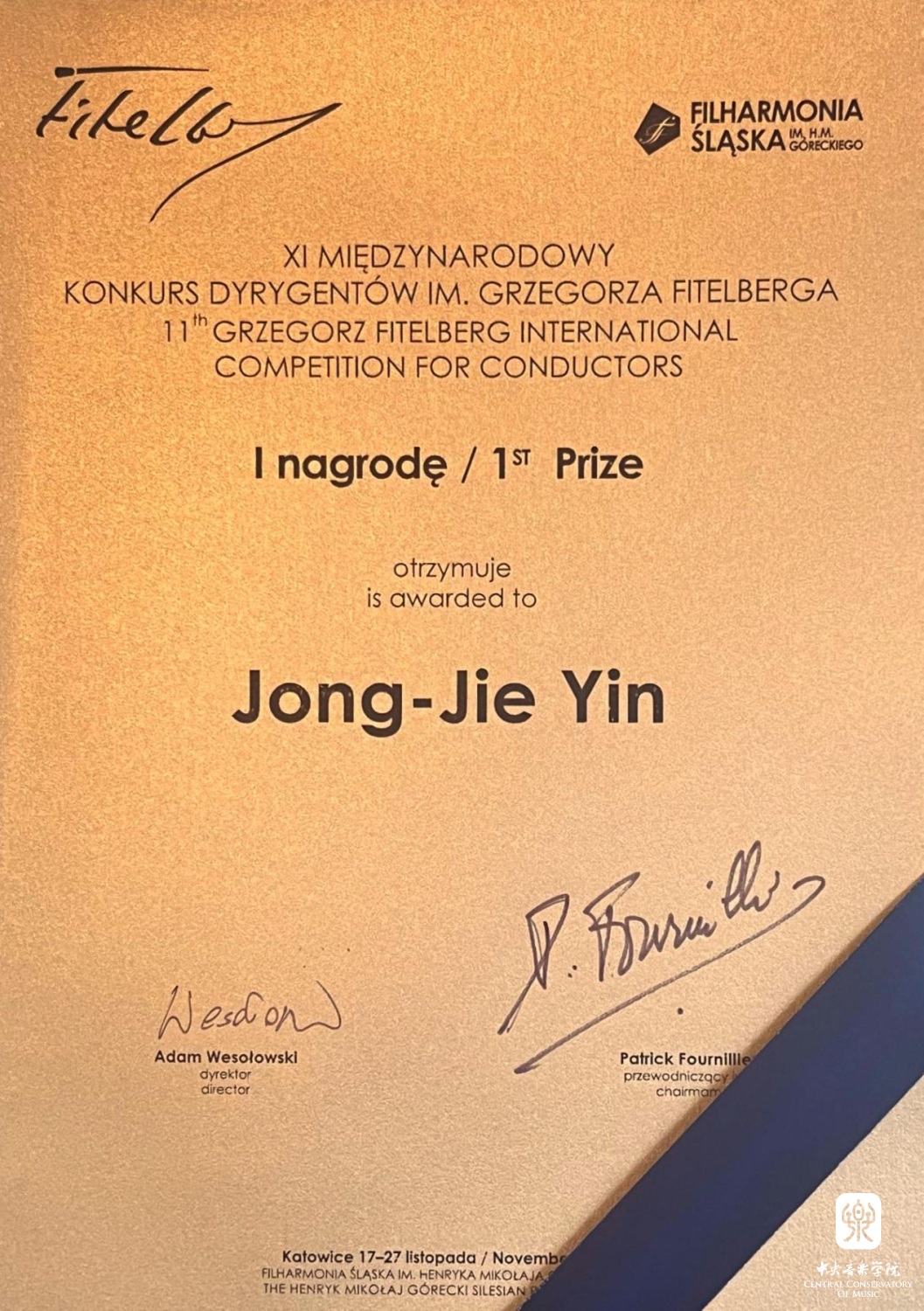 在刚刚落下帷幕的“波兰第十一届菲黛尔伯格国际指挥比赛(11th Grzegorz Fitelberg International Competition for Conductors)”中,best365指挥系硕士研究生一年级尹炯杰(指导教师:陈琳教授)凭借一流的专业水平和极强的艺术感染力在激烈角逐中拔得头筹,荣获第一名、“金指挥棒”奖、杰西·塞姆科夫基金会(Fondation Jerzy Semkow)特别奖、“最佳波兰作品诠释”奖以及路德维希·凡·贝多芬协会颁发(作曲大师潘德列茨基遗孀亲自颁发)的“伊丽莎白·潘德列茨基(Nagrode Elzbiety Pendereckiei)”特别奖。在此,向获奖学生尹炯杰及其指导教师陈琳教授表示热烈祝贺(点击查看获奖视频)。