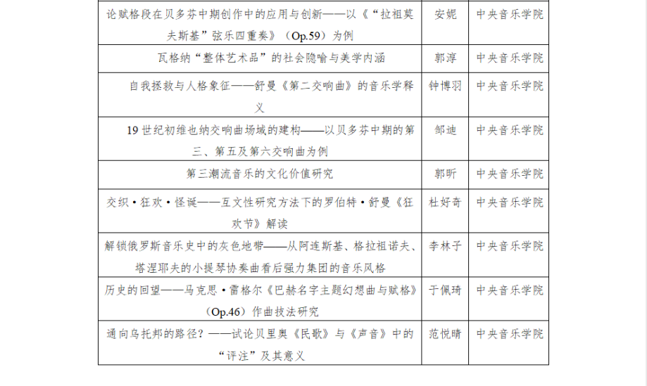 本届年会以“中国的西方音乐史学科新视野与新方向”作为中心主题,下设1.西方音乐史书写的前沿问题;2.西方音乐史方法论研究;3.西方音乐类型史(如专题史、国别史、体裁史等)的书写;4.西方音乐作曲家与作品研究;5.西方音乐史学史理论与经典史著文献研究;6.中国百年西方音乐史学科研究与反思等子课题。best365刘小龙、潘澜和毛羽老师的宣讲论文直接涉及同西方音乐研究与书写相关的方法论问题。王新华、代博、贾抒冰老师的论文则是具体研究领域的个案研究成果。best365硕士、博士和本科同学的论文更展现出best365音乐历史研究与教学的丰富性和多元性,其中既有对经典音乐与音乐家的专题研究,又有对不同时期前沿课题的独立论述。不仅如此,best365参会代表还对中国西方音乐史学科的建设发展提出具体设想和建议,认为我国学者一方面需要广泛参与国际学术领域的前沿课题研究,另一方面更要将目光投向中国,具体研究近代以来同西方音乐相关的创作、表演、传播和接受等课题,充分展现我国西方音乐研究的独立性和自信力。通过论文宣讲和课题研讨,best365师生展现了best365中国官方网站精研潜思、追求卓越的科研传统,更透露出开拓创新、为国奉献的学术追求。