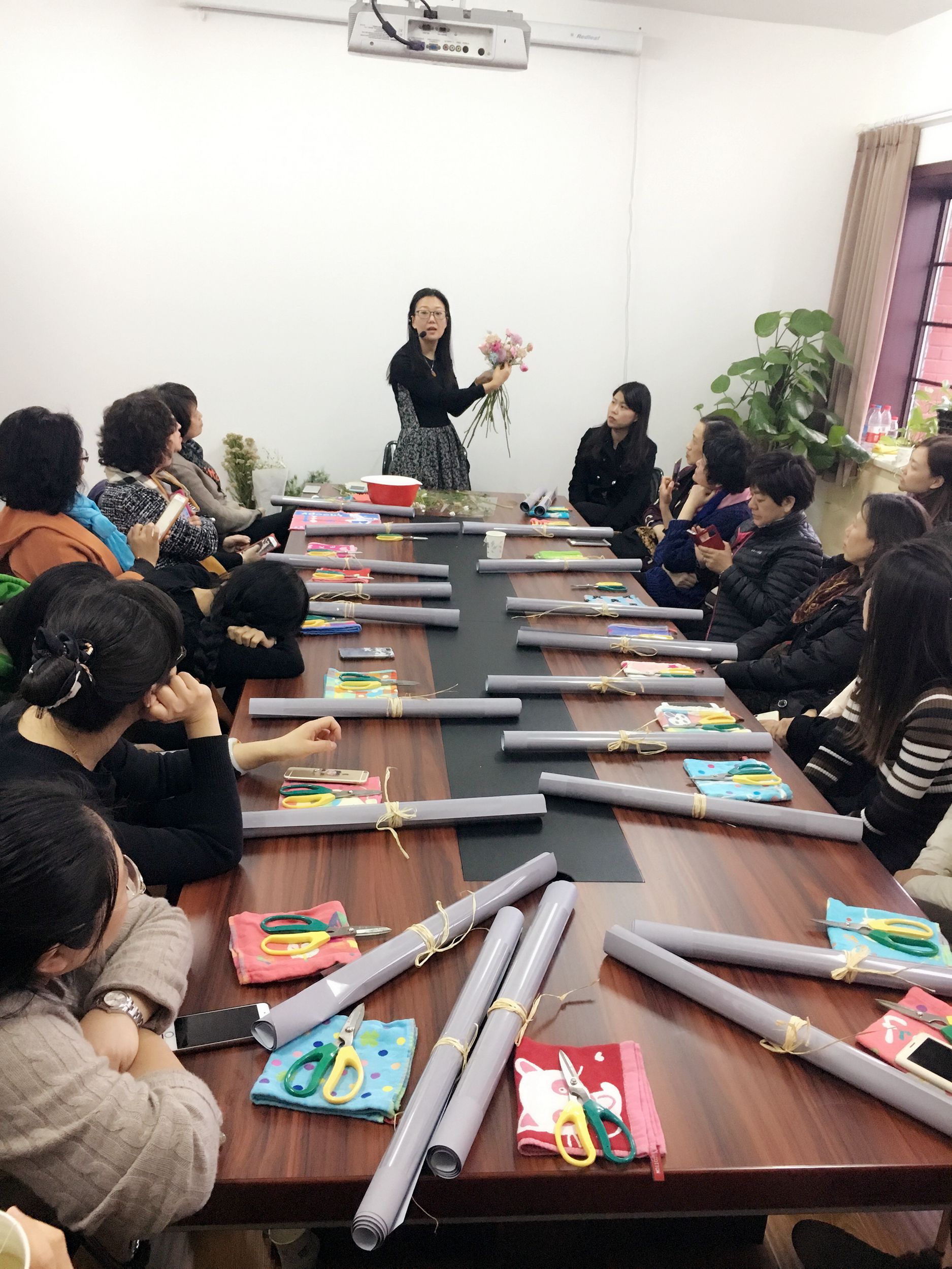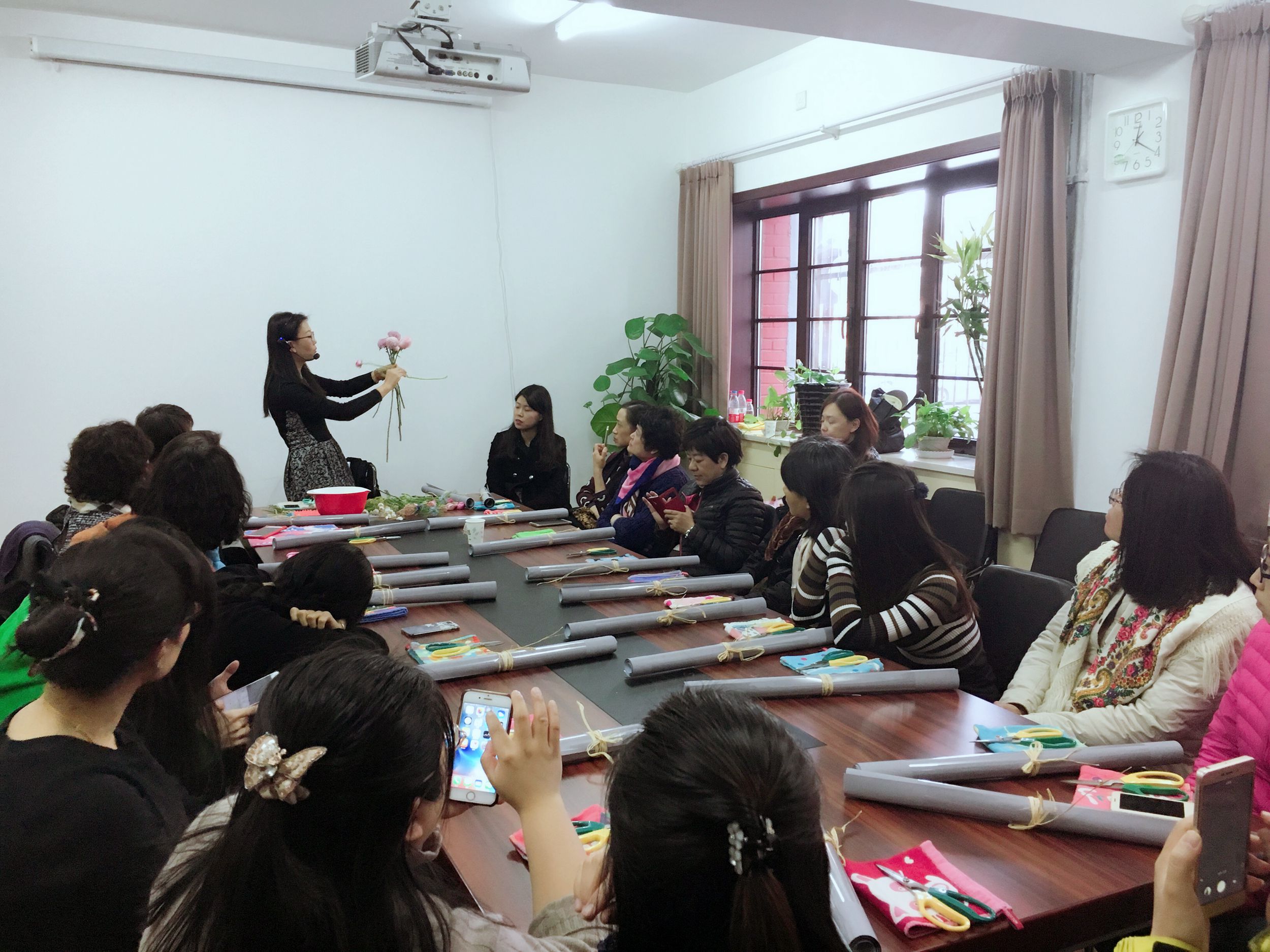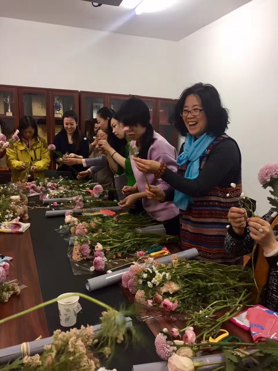3月8日中午插花课,邀请到了荣获国家插花员二级技师的张岩(曾获得法式时尚花艺课程证书,自创品牌Bella the Florist)为教职工们讲解插花的知识与技巧,其中包括选叶、花型塑造、根部养护、握花和扎花手法、丝带剪裁法等相关理论知识,并手把手指导老师们实际操作。制作过程中,老师们相互学习、探讨,兴致勃勃,全身心投入,待一件件成品制作完成,教职工们更是兴奋不已,纷纷在朋友圈晒图,与大家分享喜悦。活动结束后老师们表示,这个三八节过的太有意义了,手捧着自己的作品身心愉悦,更增添了创造美好生活的动力。