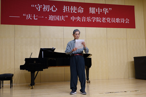 今天歌诗会的压轴节目是88岁高龄的舒咏梧老师的诗朗诵,诗作由舒老师专为党的98岁生日创作的七绝六首《颂歌献给建党98周年》,字里行间都是最真挚的深情,表达了一位老党员在党的98岁生日之际,向党表白永远跟党走的决心和信念。