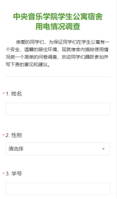 学生公寓管理强化服务育人的教育理念,积极解决学生在公寓生活中遇到的问题和困难。不定期开展问卷调查,及时客观的了解学生所需,解决学生所愁。近期开展用电情况调查,宗旨是在保障安全的前提下尽量满足学生用电需求。