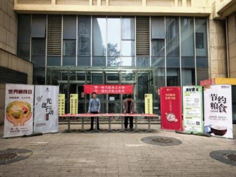 活动现场,楼宇前悬挂 “一粥一饭当思来之不易,一丝一缕恒念物力维艰” 红色横幅,长桌上铺展 “每一粒米,都是耕耘的音符;光盘行动,谱成感恩的乐章” 签名条幅,两侧设 “世界粮食日”“节约粮食” 主题展架,以图文传递节粮理念。