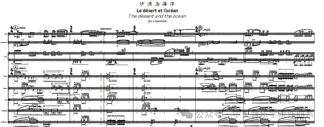 《沙漠与海洋》的音响较为“饱和”,似对“沙漠”,“海洋”这样大型地理单元的描绘,作曲家在听觉上营造出流畅的,势不可当的音响流,好似对地理和历史进程的描绘。