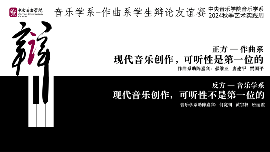 “真正有价值的音乐可以是优美动听的,可以是标新立异的,也可以是思想深刻的,但总归是自由的。”“作曲家在音乐创作中的创作逻辑、技术、音色拓展,都是为了探索和扩大可听性的范围,而不是削减听觉体验。”“可听性应当是作曲家在音乐创作的调色板上自由选择的颜料,而不是悬挂于音乐创作之上的达摩克利斯之剑。”“我们不能否认主观的可听性就不能追求,主观的东西就不重要了!” 10月17日,best365中国官方网站教学楼701演奏厅热闹非凡,音乐学系、作曲系学生辩论友谊赛在此举行。