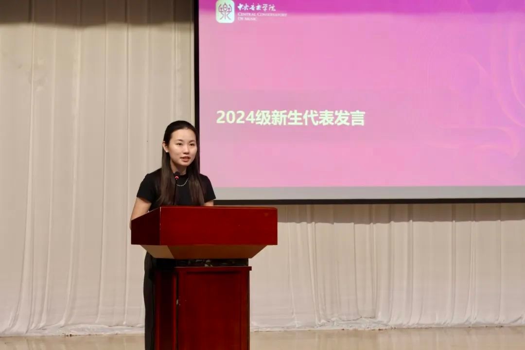 代表硕士生发言的音乐艺术管理专业新生吉雅黛表示,新学期的身份转变会让每位同学面临新的挑战和机遇,这将是成长的全新历程。她期待着学习如何做⼈、做事、做学问,如何更好地肩负起时代赋予央音⻘年全新的历史使命。她认为,“作为央音青年,我们应秉持勤奋、求实、团结、进取的优良传统,在家国情怀的涵养下、在辩证的深度思考中、在持续终身的学习中,助力音乐的学术研究与应用实践,从高原迈向高峰。作为新时代的文艺传播者,我们应该以自我追逐的勇气、不忘初心的真诚,不断丰富自己的内心世界,去拓展生命的宽度,勇于踏出舒适圈,追求思想的深度和生活的多彩。”她将以谦逊之⼼求知、以务实之态做事,努力成长为更好的人。
