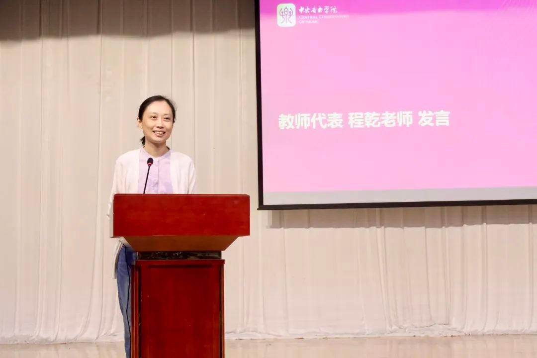 音乐美学教研室程乾副教授作为教师代表发言。她向同学们分享了三个心得:“第一,放下功利心去读书,去阅读期而未得的经典,去绸缪梦而未现的图景。第二,尊重自己的节奏,唤醒判断力和好奇心。鼓励同学们以新的形式和内容向传统致敬。第三,重体验、养德行,以陶渊明‘虽未量岁功,即事多所欣’的精神感受当下。”她娓娓道来的亲切嘱咐提醒着同学们在学术道路上要有纯粹的追求与耕耘,要建立起自己的独立思考能力与判断力,要在忙碌的校园生活中给自己留一片体验与实践的空间,让大学生活思学并重,德行双修。