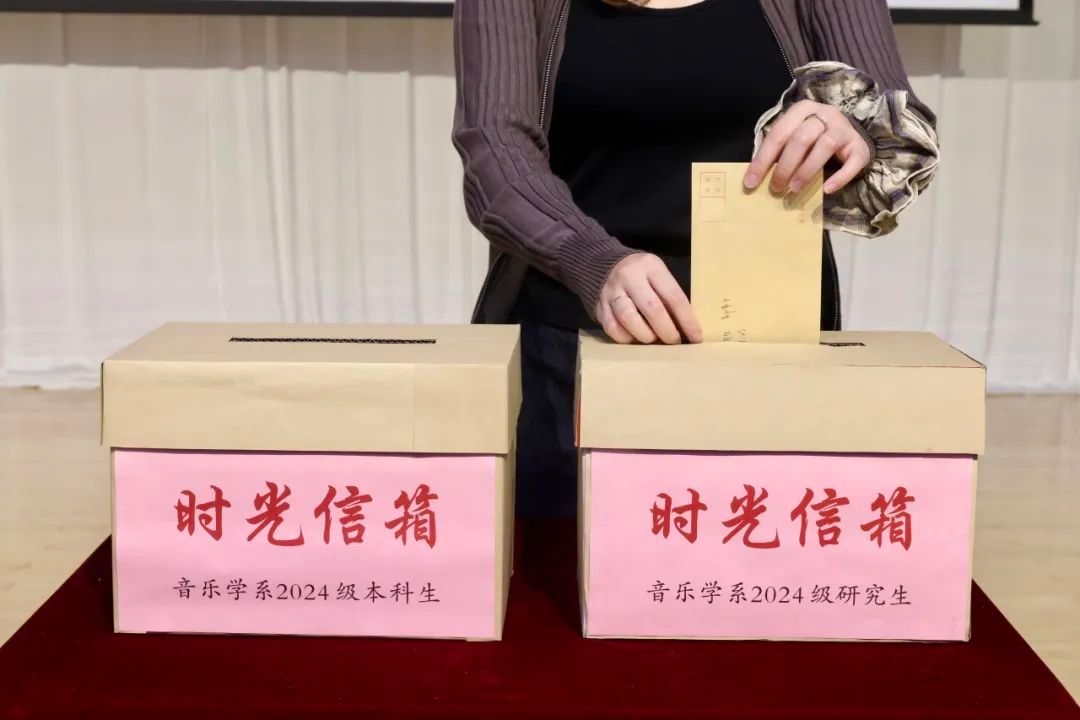 别出心裁的“时光信箱”投递环节令人印象深刻。每位新同学都给未来毕业时的自己准备了一封信,投入台上的信箱,待到未来挥别校园时再打开。这些话语记载了扬帆启航的新同学们对大学生活的期盼,以饱含希冀的字迹织就一颗温暖的种子,在薪火相继的校园中深深埋藏。它们寄托着同学们对未来的自己沉甸甸的期盼和祝福,也承载着师者的遥祝与关怀。满载着师长们的殷殷期望,2024级的新生们在温暖的灯光中寄出了那封未来之信。