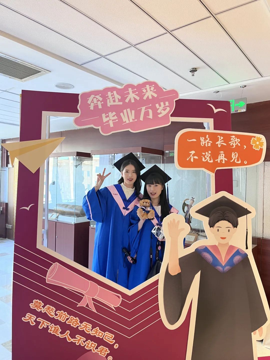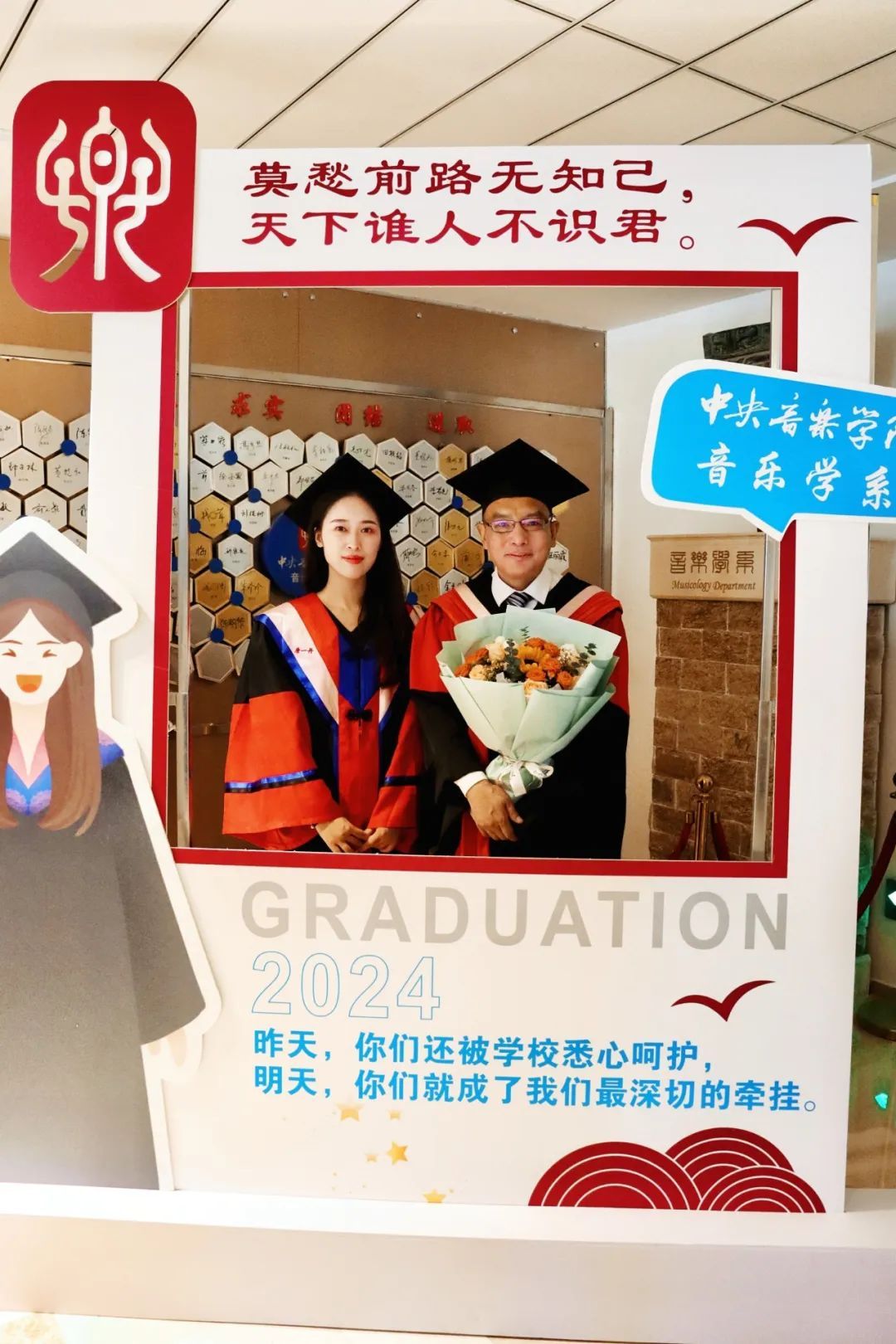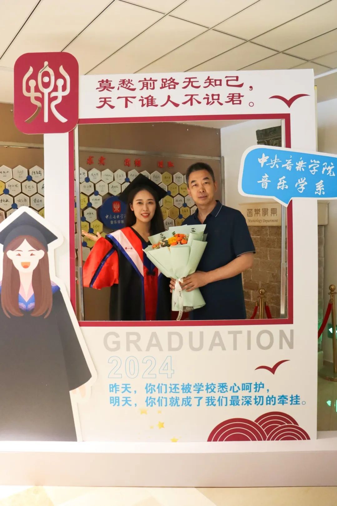 当毕业生和亲友们踏入音乐学系所在的教学楼七楼时,率先映入眼帘的是一排精心布置、独具音乐学系特色的“打卡点”。“一路长歌,不说再见”“奔赴未来,毕业万岁”“莫愁前路无知己,天下谁人不识君”,这些美好的祝福承载着音乐学系对毕业生们的关怀和期许,包含着毕业生们在音乐学系大家庭中幸福而充实的回忆,使得这场毕业典礼别添了一份温暖,也吸引了音乐学系乃至全校的师生家长纷纷“打卡”,在这里留下青春最美好的回忆。