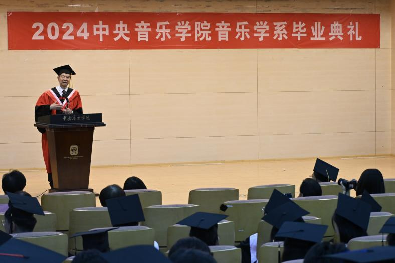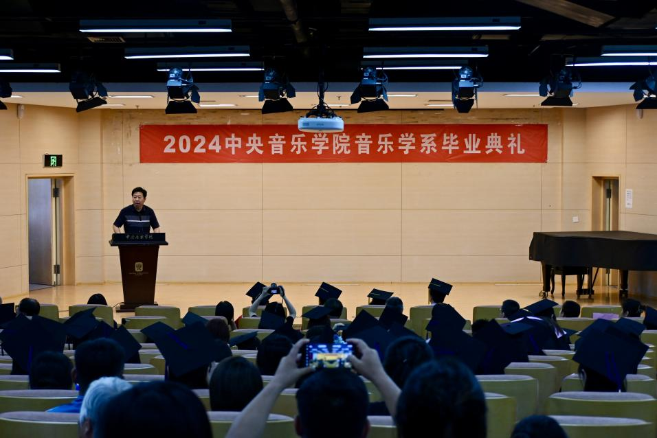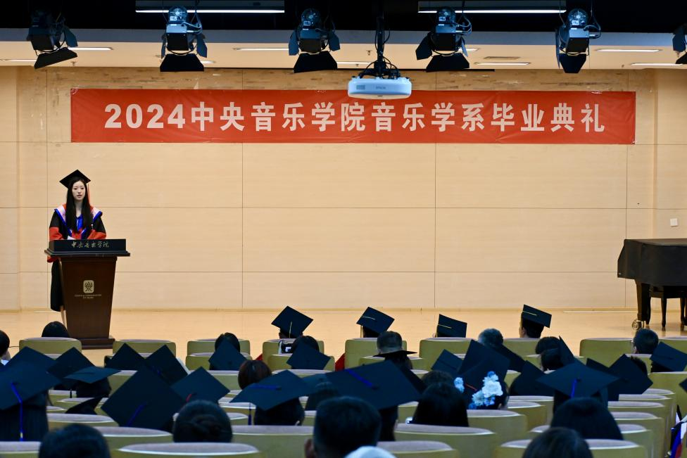 在欢快的氛围与热烈的掌声中,毕业典礼正式拉开帷幕。音乐学系系主任何宽钊用亲切的口吻向毕业生们表达了关怀、期许和祝福,他从学生们生活中点点滴滴的心迹谈起,从学生面临毕业所最为关切的问题和不舍心态出发,向同学们诉说了母校母系对于他们的牵挂。在致辞中,他引用了唐代诗人高适“莫愁前路无知己,天下谁人不识君”的豪迈诗句来展望毕业生们的未来,他指出,学校学到的有形知识只是一方面,央音的气度,央音的视野、央音的格局,央音的精神品性将会对同学们产生更为深远的影响。进而,何宽钊主任对毕业生们提出四点期许:涵养深厚的家国情怀、加强辩证全面的深度思考力、保持终身学习的习惯和动力、理解包容具体而不可爱的人。