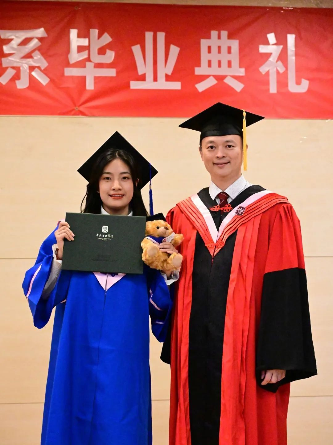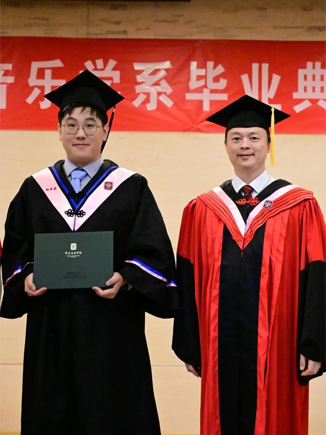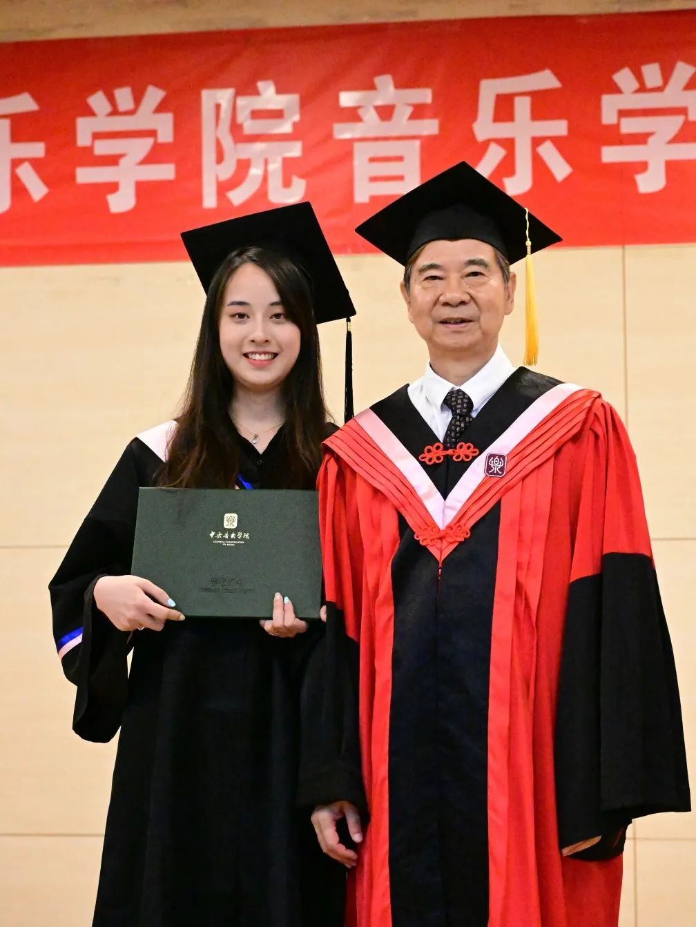 典礼的最后,是在场师生家长们最为期待的拨穗环节,毕业生们依次上台,苗建华、柯杨、王次炤和何宽钊四位师长亲手为他们拨穗正冠,以志圆满完成学业。拨穗、握手、扶帽正冠,音乐学系又一届优秀的毕业生、又一群被师长和亲友们牵挂的孩子们、又一批我国文艺事业的新生力量即将从这里出发,奔赴山海。云程发轫,万里可期,在这里祝所有音乐学系2024届的学子们,毕业快乐!
