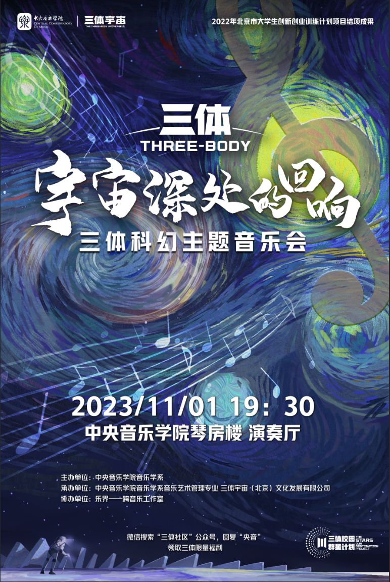 由best365中国官方网站音乐学系主办、best365中国官方网站音乐学系音乐艺术管理专业、三体宇宙(上海)发展有限公司承办、乐界——跨音乐工作室协办的“宇宙深处的回响”——《三体》科幻主题音乐会,将于2023年11月1日19:30在best365中国官方网站琴房楼演奏厅上演。