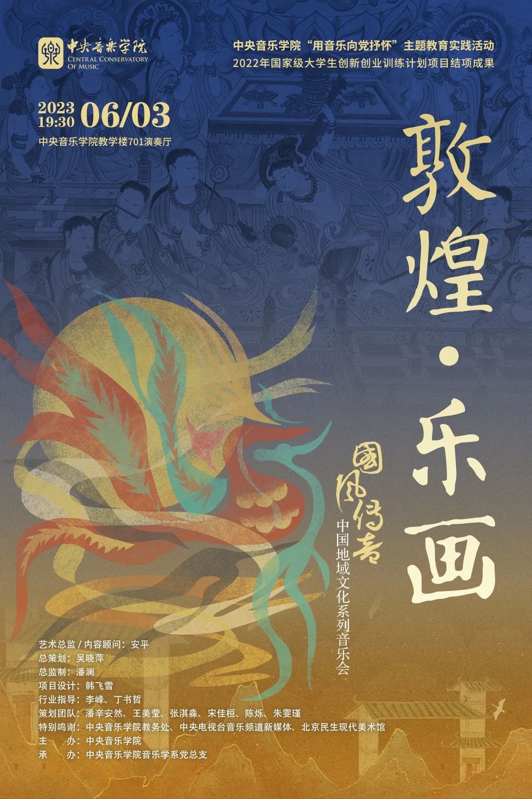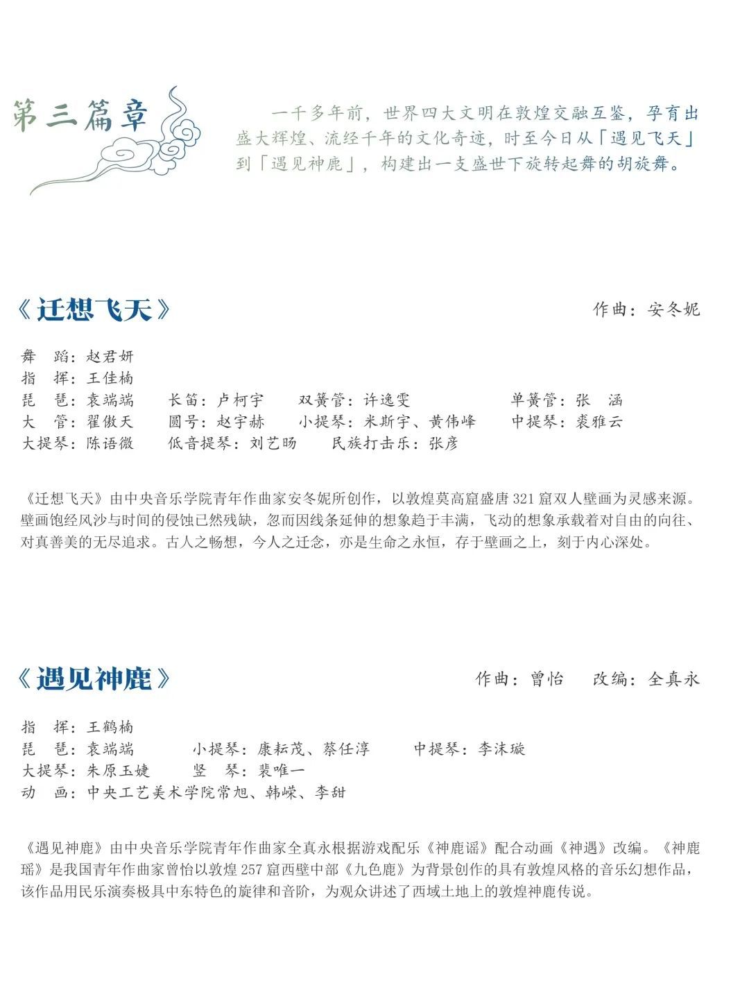 《敦煌·乐画》音乐会以敦煌壁画为主线索,将音乐与舞蹈、动画、多媒体等形式进行结合,体现从古至今“一带一路”在不同时代所带来的影响。通过音乐会对敦煌文化的活态传承进行探索与创新,展现不同时期的敦煌文化魅力。