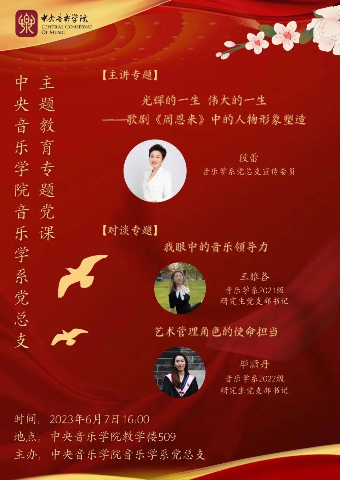 第一场党课讲座将由音乐学系党总支宣传委员段蕾副教授与研究生党支部书记王雅各、毕潇丹围绕歌剧《周恩来》的创作及人物塑造展开。