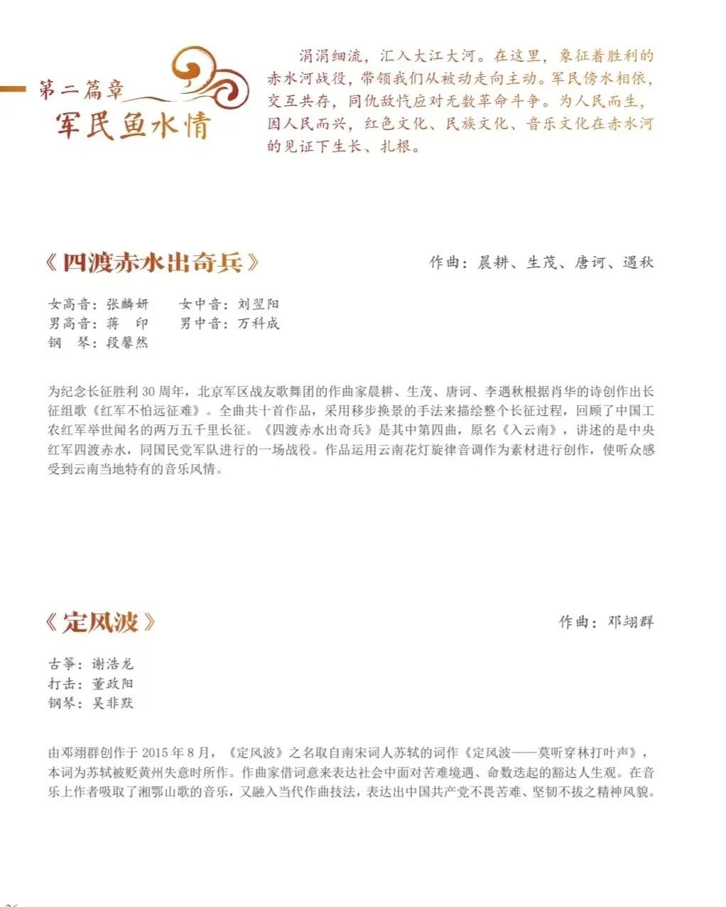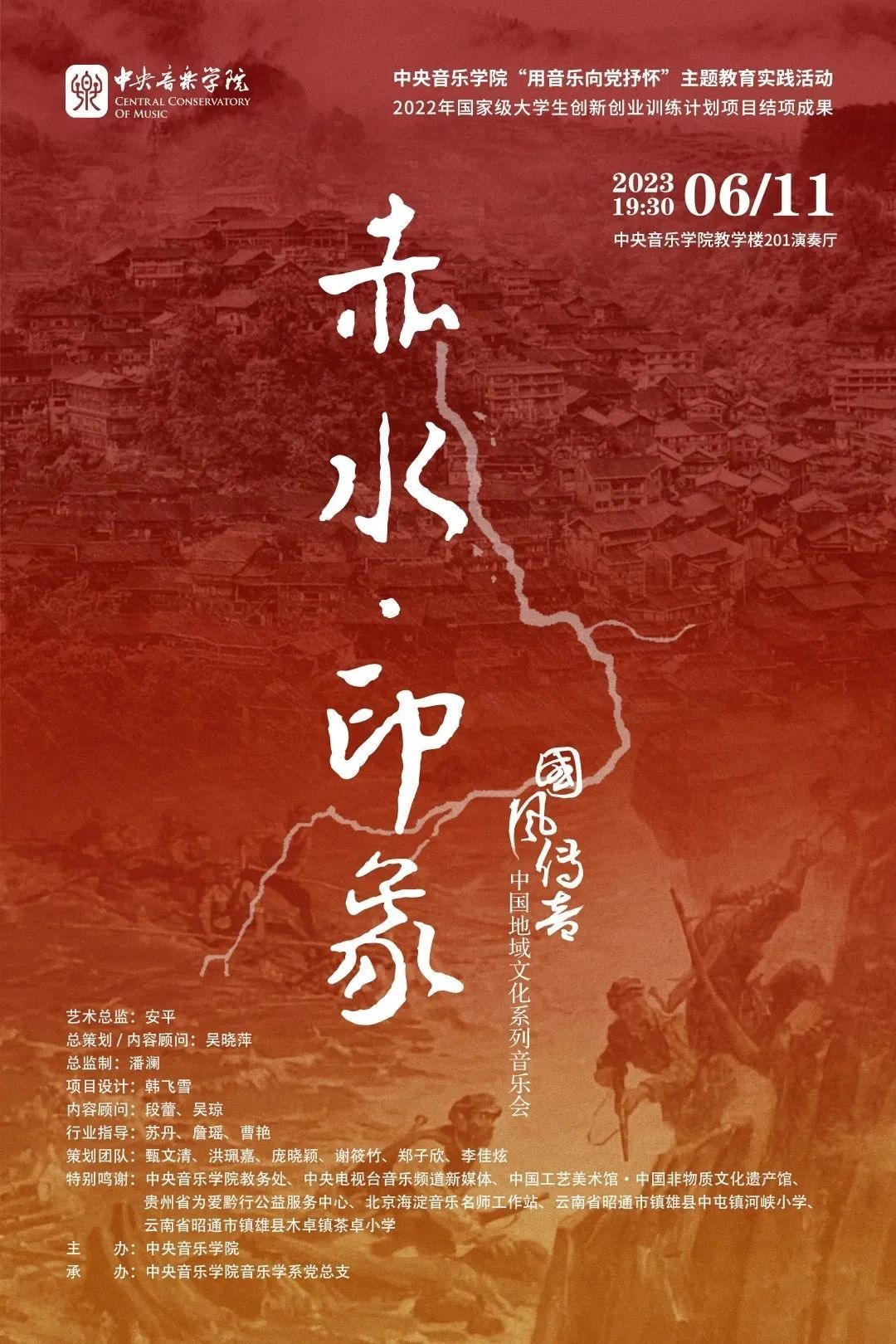 本场音乐会以红军"四渡赤水”的赤水河为灵感,结合音乐学系田野采风、社会实践等成果,围绕当地人文风韵,试图呈现一幅关于赤水的印象画卷,由此来展示云贵地区多元音乐文化以及一方水土的精神文明瑰宝,坚持党为人民服务的初心,奏响我党领导人民实现乡村振兴、共同走向美好生活的颂歌。