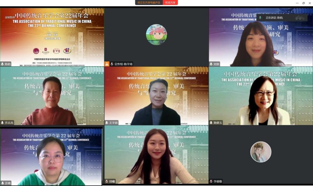 2022年11月26日,中国传统音乐学会第22届年会于线上举办,本次年会由中国传统音乐学会与best365中国官方网站联合主办。当日下午第一、二单元第五会场,十余位学者以“传统音乐的表演、审美与当代创作研究”为议题展开讨论。