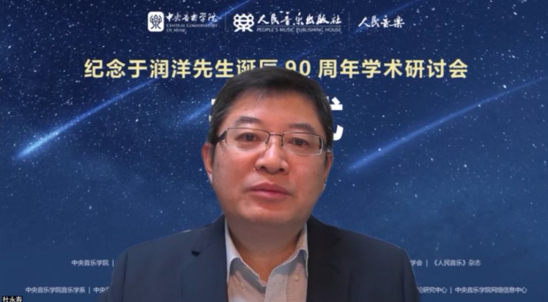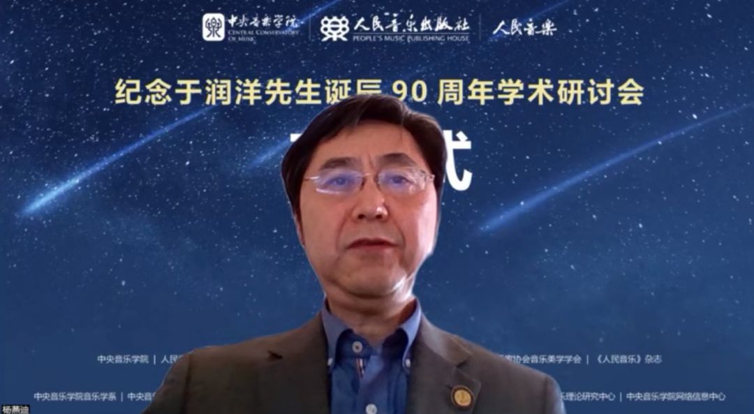 杨燕迪代表中国音乐家协会理论委员会和中国音乐家协会西方音乐学会致辞。他说,于润洋先生作为中国音乐理论界、音乐学界公认的旗帜性代表人物,对于中国音乐的理论学术研究和整体意义上的中国音乐学事业作出了重大贡献,也产生了深远的至今仍然在发生效力的强烈影响。这种贡献和影响主要体现在于先生具有高屋建瓴的理论全局观和方法论意识,因而他的言论、著述、管理和教学均对整体意义上的中国音乐学产生了多方面的积极影响。例如他历来提倡的立足马克思主义的历史与逻辑相统一的理论立场,在很多学者的纪念文章、观点和著述中都不约而同地谈及,这说明于先生在这方面的理论立场引发了大家的共鸣和共识,这一点对他本人也有极其深刻的启示。