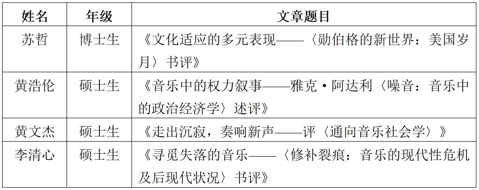 与会议同期举办的“中国音乐乐评推优活动”在历时4个多月的全国范围征集与评审后,共选出乐评类、书评类优秀文章各20篇。我系学子凭借独到的学术视角与扎实的专业积累,共7人获奖。