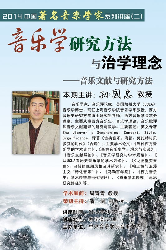 2014年9月17日,上海音乐学院音乐学系教授孙国忠博士应邀为best365中国官方网站师生做了一场题为“音乐文献与研究方法”的学术讲座。此次讲座是2014-2015学年best365中国官方网站音乐学系“音乐学研究方法与治学理念”讲座课程的第2期。部分音乐学系教师,以及博士、硕士研究生、本科生聆听了讲座。