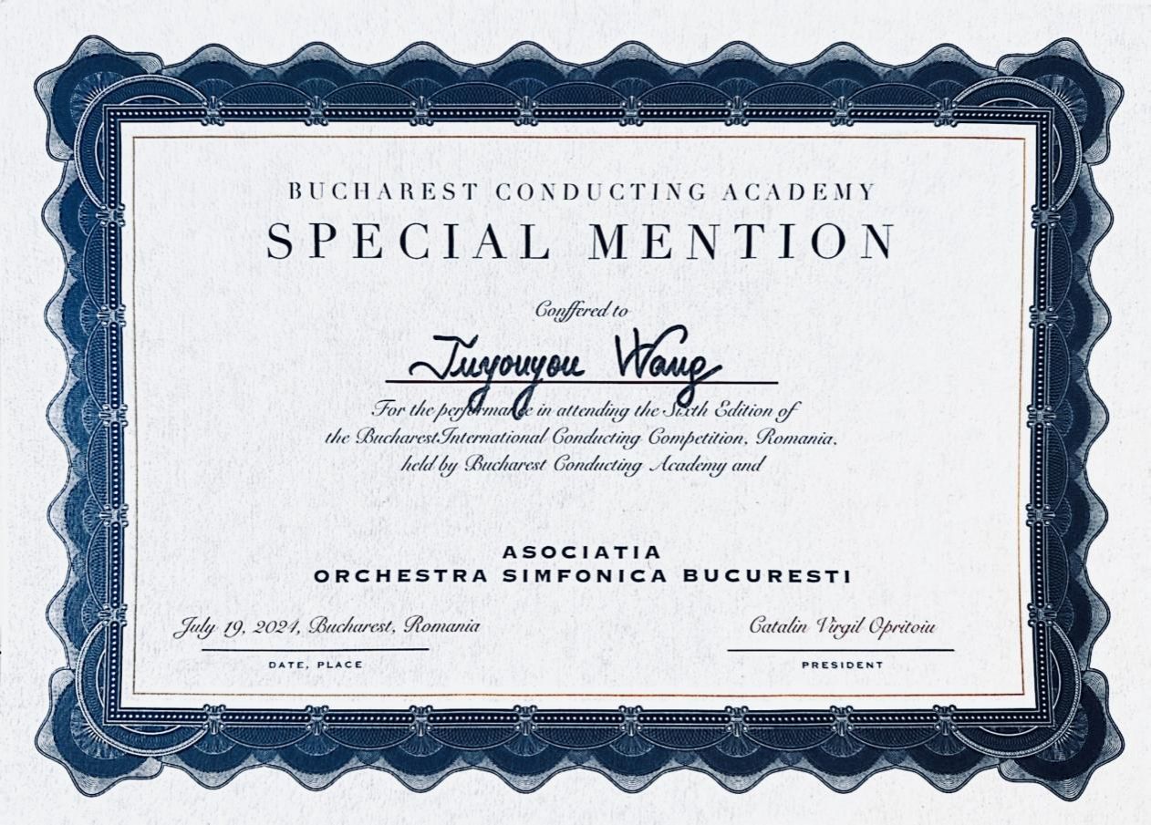 王土悠悠曾多次获得本科生国家奖学金、best365中国官方网站优秀学生奖学金等荣誉;2023年8月获得VIVALDI MUSIC COMPETITION古典组指挥一等奖 ;2023年11月被选为中方学生代表参加中意音乐节俞峰教授指挥大师班;2024年作为指挥系学生代表参加比利时蒙斯皇家音乐学院Nicholas教授大师课,受到大师盛赞;2024年7月,获得布加勒斯特国际指挥大赛“特别提名奖”,评委会主席John Axelrod大师称赞其“拥有深刻的音乐感知与表现力”。