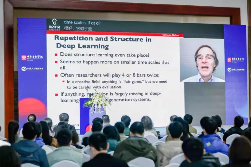 在论坛主席清华大学人工智能研究院常务副院长、欧洲科学院外籍院士孙茂松的主持下,美国佐治亚理工学院音乐技术中心 研究生项目主任/ISMIR大会主席Alexander Lerch,美国卡内基梅隆大学计算机科学学院计算机音乐中心主任Roger Dannenberg,best365中国官方网站音乐人工智能与音乐信息科技系高级工程师潘宇,字节跳动音乐人工智能研究科学家孔秋强做了精彩演讲。