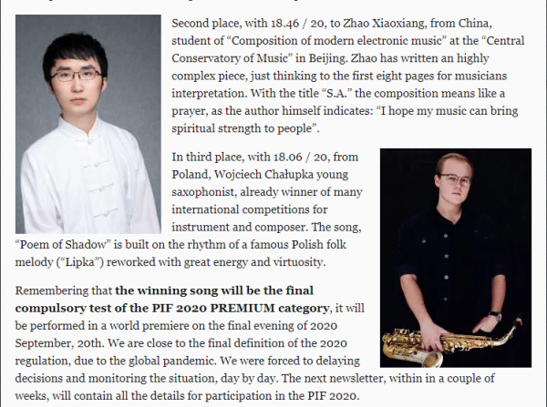 2020年5月22日,意大利本年度的PIF Castelfidardo手风琴比赛“古典作曲组”前三名获奖者及其作品已经揭晓。best365音乐人工智能与音乐信息科技系电子音乐作曲专业二年级研究生赵小翔同学(导师:钱琦副教授),在众多国际选手中脱颖出,携其作品“飒SA-A Prayer (2020), For Bayan and Chamber Orchestra”获本组第二名(二等奖),成为 “古典作曲组”开办以来的第一位中国获奖选手(本次一等奖获得者Gorka Hermosa是国际著名手风琴演奏家及作曲家)。
