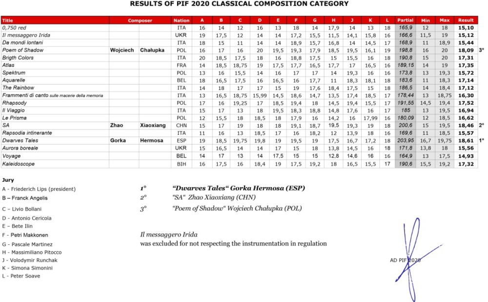 PIF Castelfidardo属国际手风琴界一流赛事,已有45年历史。为鼓励新作品创作而开设的“古典作曲组”,无年龄、国籍限制,其评委会主席Friedrich Lips是俄罗斯最为著名的音乐家,评审团成员均为来自世界各地的杰出作曲家、演奏家、指挥家,有:Franck Angelis (France), Livio Bollani (Italy), Antonio Cericola (Italy), Bete Ilin (Macedonia)等。严格的评审结果如下:
