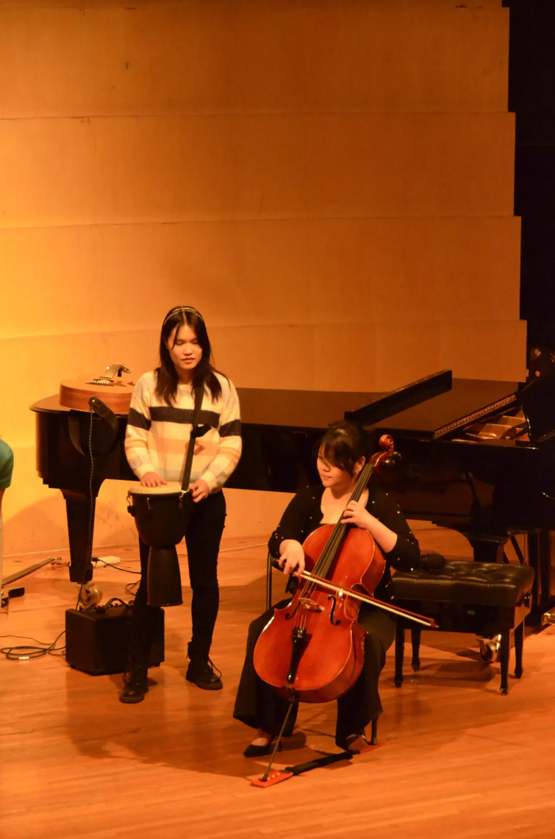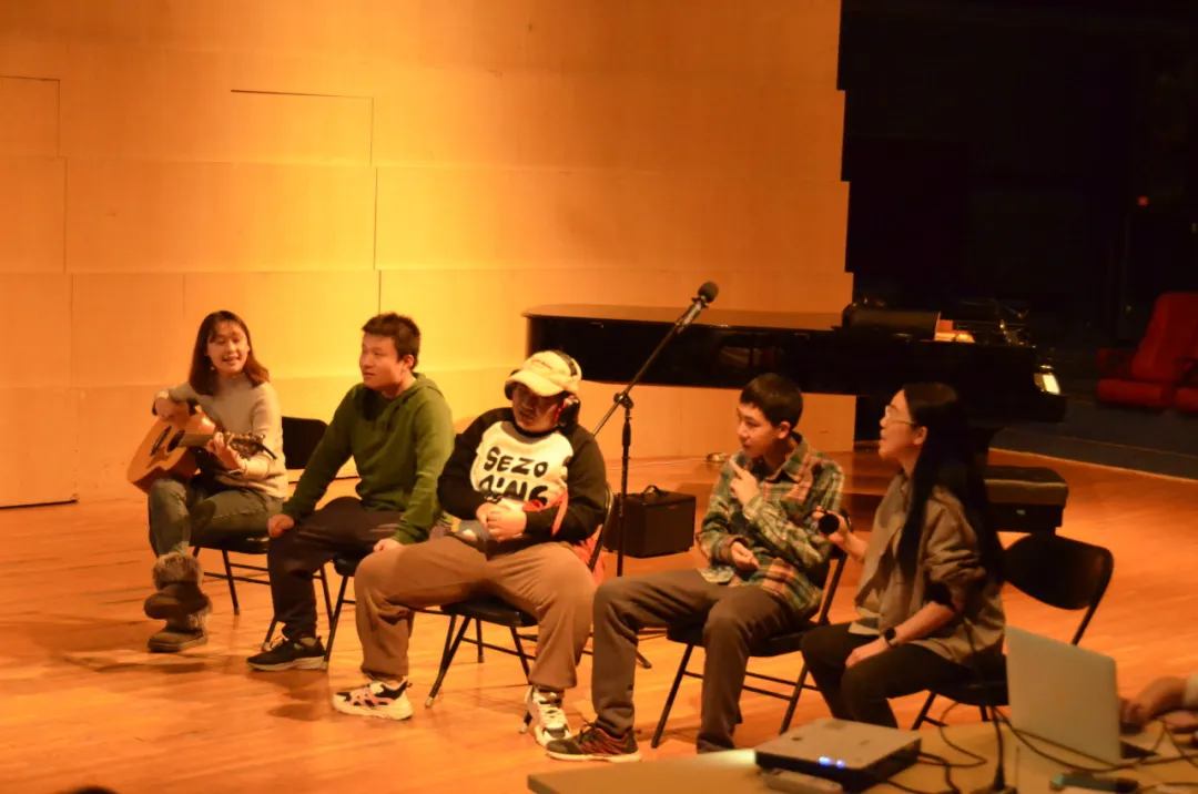 一支特别的乐队——由治疗对象烜卿担任主唱,22级本科生刘俊汝、崔乔喻、张浩宇、23级本科生刘欣雨分别担任键盘手、贝斯手、鼓手和吉他手的“烜卿乐队”为大家带来了歌曲《大海》和《我的未来不是梦》,点燃了现场的热烈氛围。治疗对象烜卿在台上自信大方地演唱歌曲,激昂的歌声打动了在场每一位观众的心,四位治疗师们的伴奏为烜卿的歌声锦上添花,打造了一场视听盛宴。该活动的目的是在乐队中体验、探索不同的音乐互动形式,加深对音乐的理解,感受成员间的音乐连接。