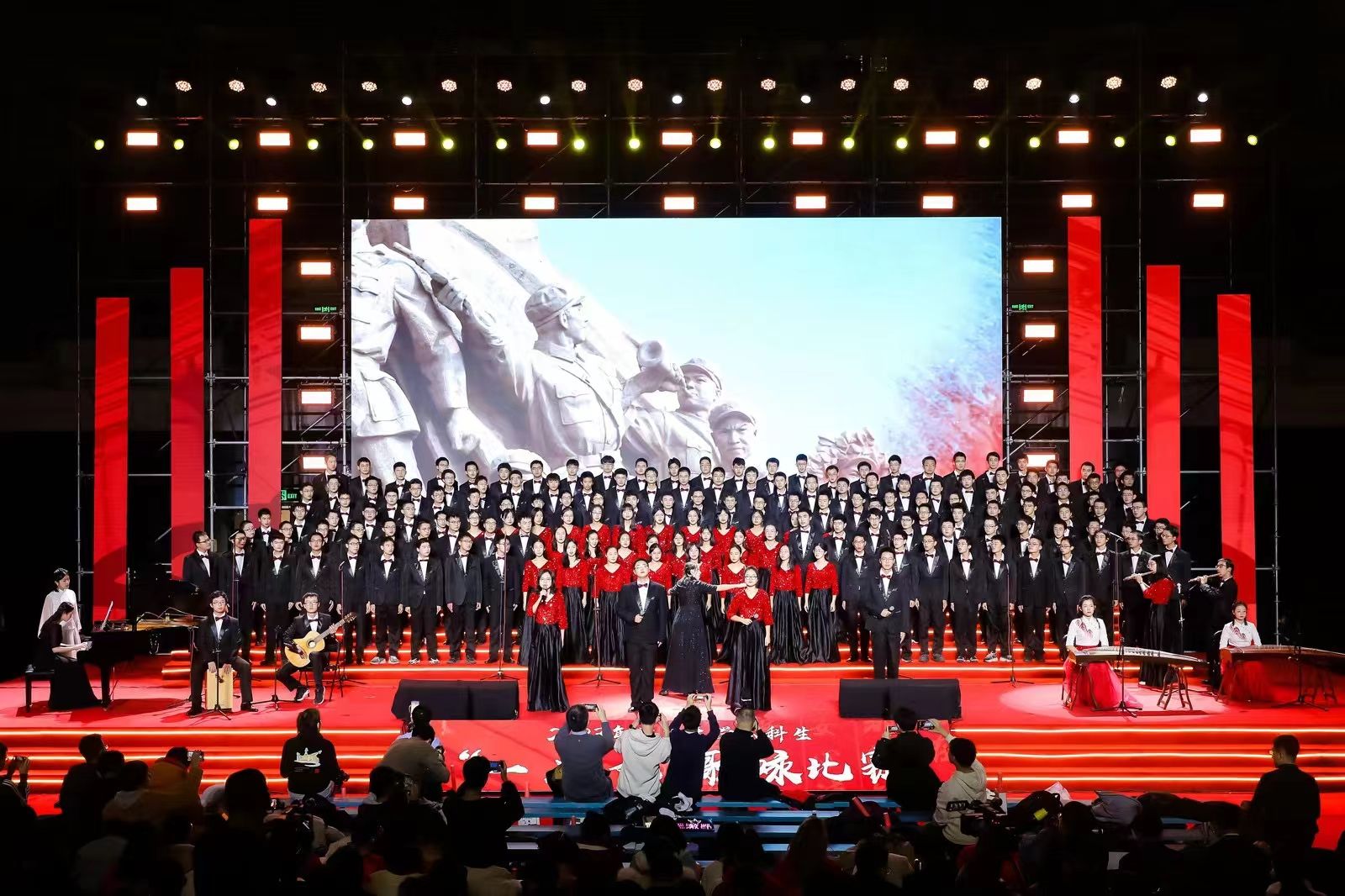 电子工程系合唱联队选择《百年守望》作为参赛曲目,陶源同学、韩诗童同学与朱哲琦同学承担合唱改编、排练、指挥、舞蹈编排工作并分别作为合唱团员和钢琴伴奏参与演出。