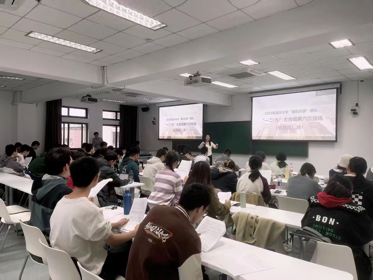 感谢院系的信任,让我们拥有了如此难忘又珍贵的一段经历,让我们结识了一群优秀又可爱的清华学子。从秋到冬,我们一起享受着音乐,也不断感受、学习“一二·九”精神。在罗姆楼,我们一次次唱响“一百年筚路蓝缕,披荆斩棘,巨龙重生;一百年宵衣旰食,栉风沐雨,神州涅槃焕新颜…”,脑海中总会浮现出百年间党和国家历经的艰难险阻与光辉时刻,同学们将这份震撼与感动化为歌声,表达着对这片土地的深情祝愿。电子工程系的同学们在繁忙紧张的课业压力下依然坚持排练,这份坚持让我们感动。在辅导员们的悉心关怀与精心安排下,每一次的排练都井井有条,认真高效;团队中也涌现出各具才华的同学们,他们激情澎湃的朗诵、技艺精湛的演奏、优美动人的舞姿和干净利落的指挥,在舞台上光彩熠熠;而后勤组和宣传组的同学们则默默付出着,为团队奔走忙碌,为大家记录下了许多精彩瞬间。能有机会与电子工程系的导员们、同学们一起度过这两个月的时光,我们感到无比荣幸和幸福。