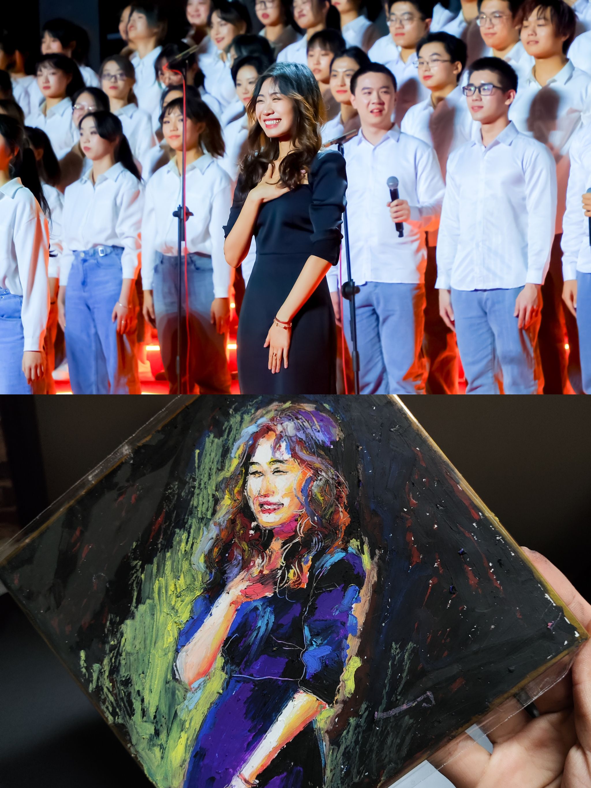 美术学院“美美有声”合唱联队选择《听妈妈讲那过去的事情》作为参赛作品,刘垚佳同学与马天一同学承担合唱编配、指挥、艺术指导及舞美编排工作并参与演出。